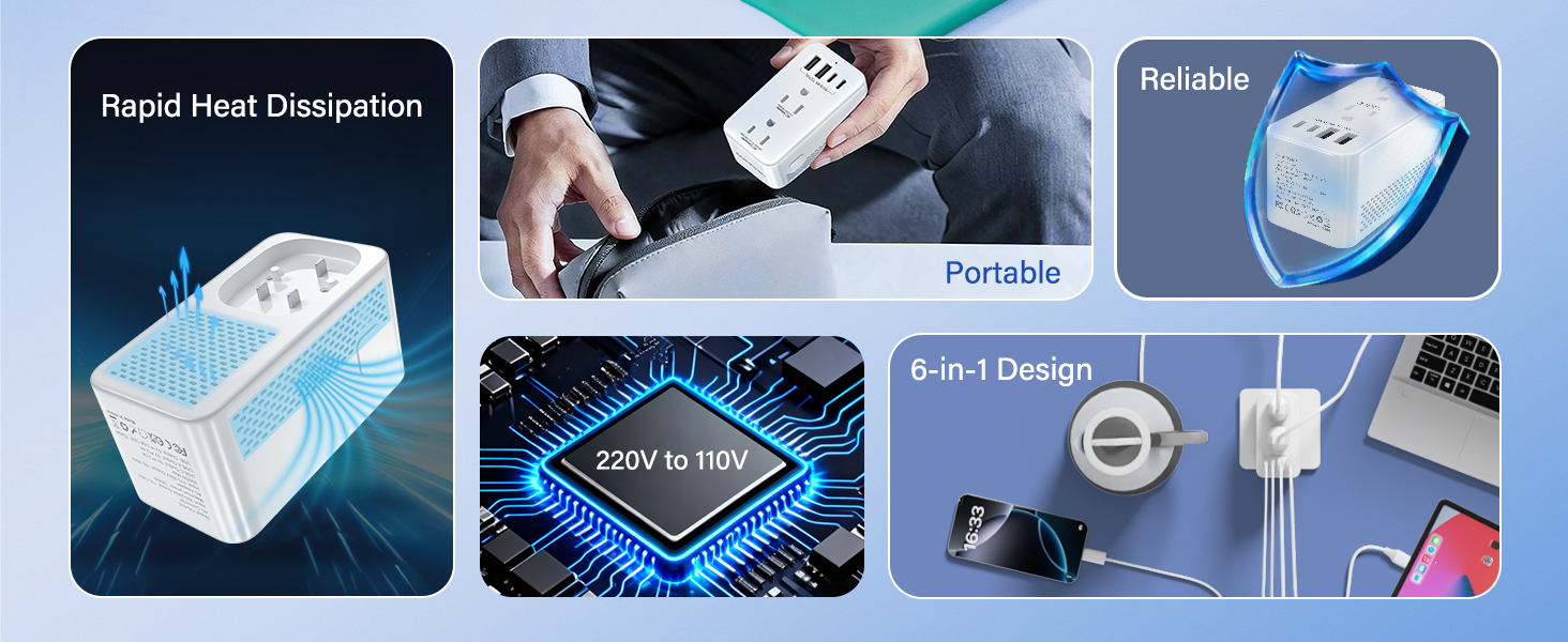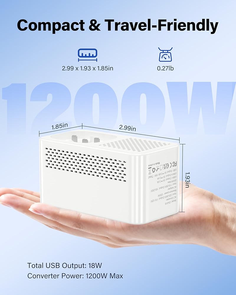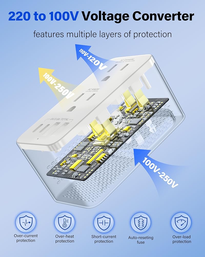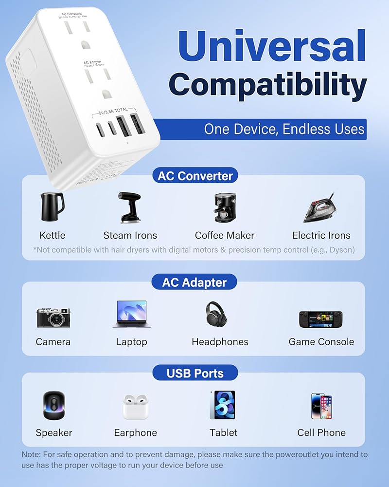 أمان متقدم مع حماية متعددة: مصمم بوسائل حماية متكاملة بما في ذلك الحماية من الحمل الزائد والتيار الزائد والدائرة القصيرة ودرجة الحرارة الزائدة. يضمن راحة البال الكاملة لك ولأجهزتك طوال الوقت. ملحوظة: هذا المحول غير متوافق مع دايسون ومجففات الشعر الإلكترونية الأخرى