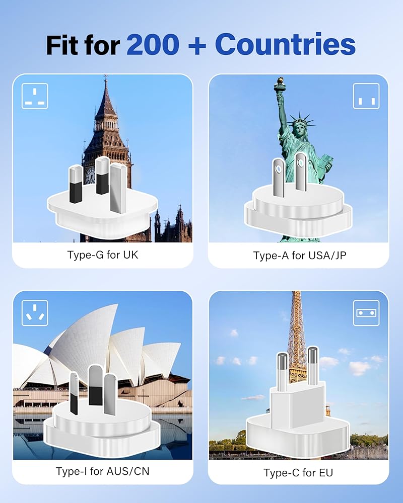 الاستخدام العالمي في أكثر من 200 دولة: يأتي مع 4 مقابس قابلة للتبديل (الأنواع C وG وI وA) المتوافقة مع المنافذ في جميع أنحاء المملكة المتحدة وأوروبا وأستراليا وآسيا وغيرها. إنه شريك السفر المثالي، وهو مثالي لشحن الأجهزة في أكثر من 200 دولة حول العالم