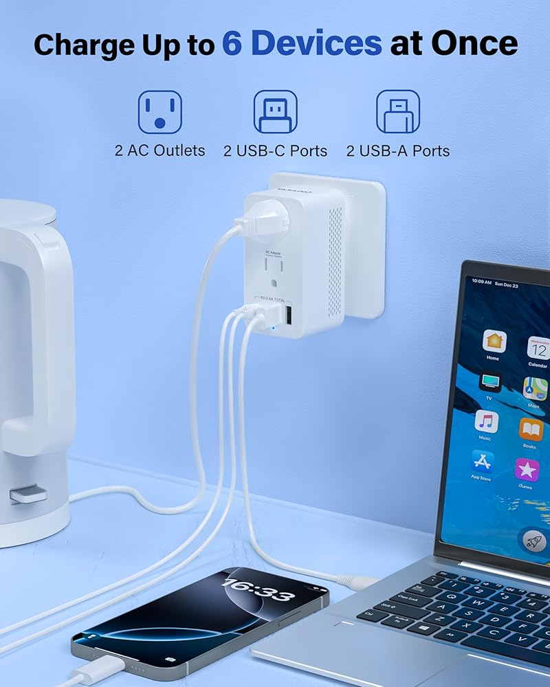 شحن 6 أجهزة في وقت واحد: مزود بمقبسين تيار متردد و4 منافذ USB، بما في ذلك USB-A وUSB-C (إجمالي 18 وات). قم بتشغيل هاتفك وجهازك اللوحي والكمبيوتر المحمول والمزيد في نفس الوقت. تأكد من بقاء جميع أجهزتك مشحونة بالكامل في المنزل أو المكتب أو أثناء التنقل