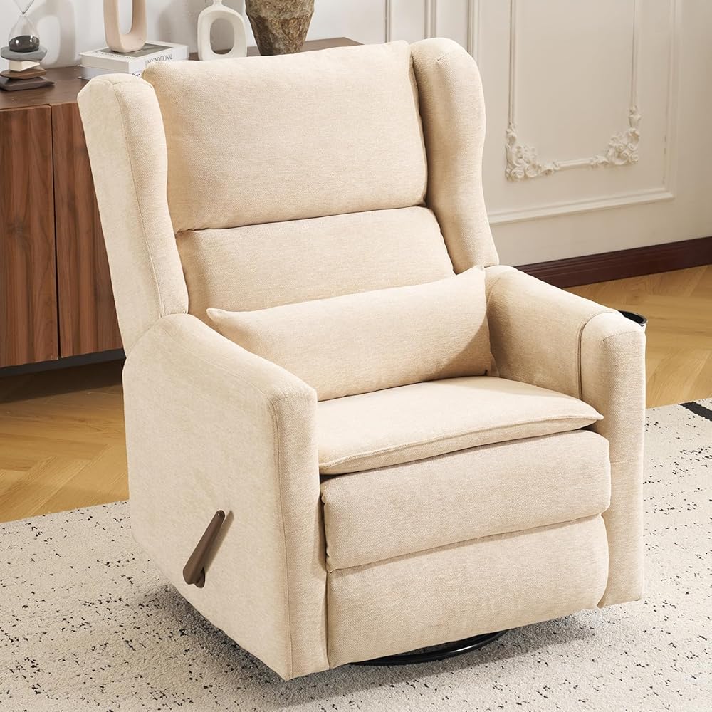 كرسي هزاز دوار كبير الحجم: يمكن للكرسي الدوار أن يدور 270 درجة بحرية ويوفر وظيفة هزاز لطيفة 30 درجة. يمكن للكرسي الهزاز المنزلق الدوار ضبط مسند الظهر إلى 90 درجة أو 120 درجة أو 145 درجة من خلال المقبض الجانبي. ما عليك سوى سحب المقبض لإمالة وتمديد جسمك. سواء كنت تجلس أو تستلقي بشكل مسطح، يمكن أن يساعدك هذا الكرسي الهزاز المنزلق على تخفيف التوتر والتعب، مما يوفر أقصى درجات الراحة والاستمتاع لحياتك اليومية.
