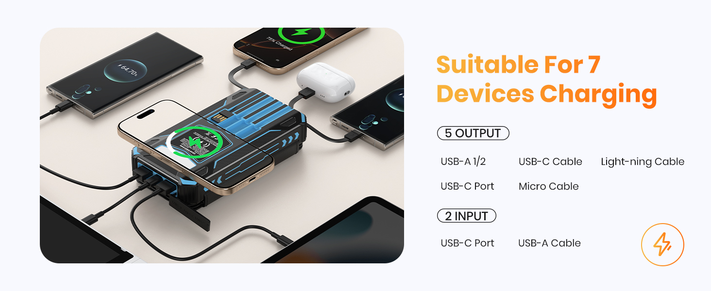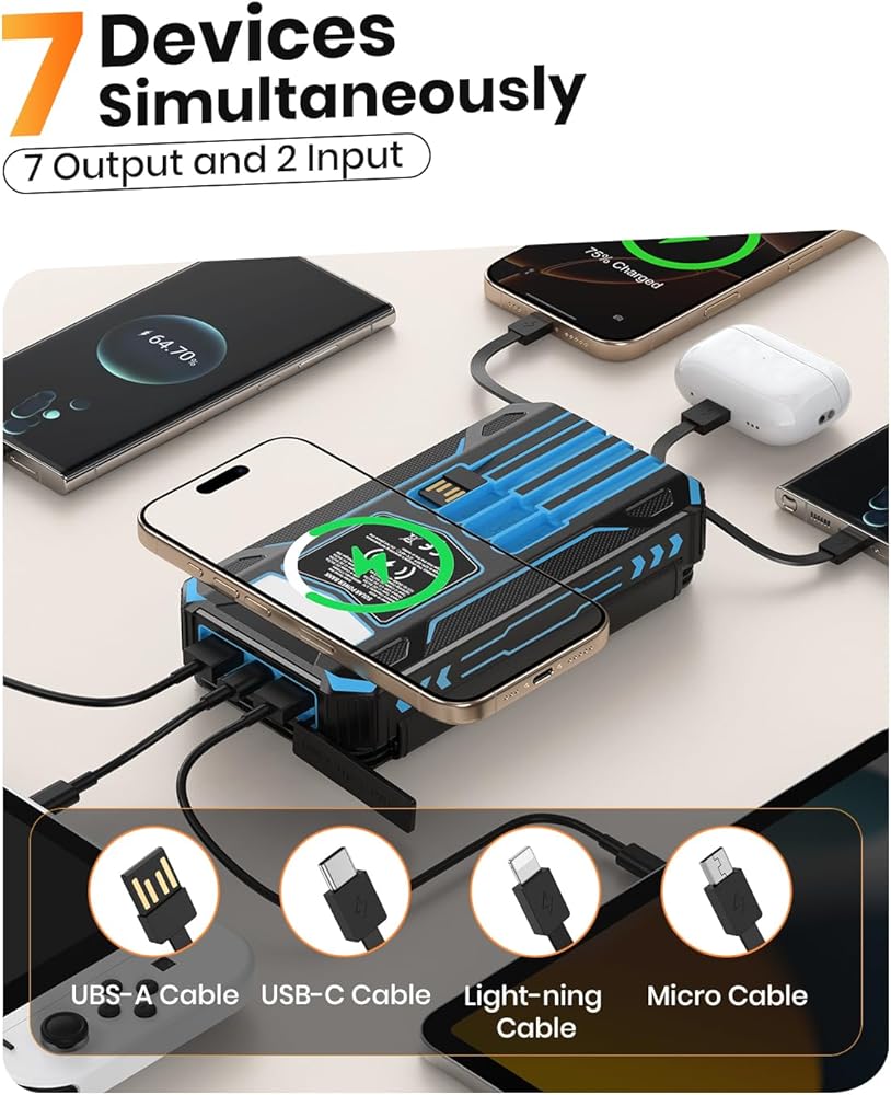 4 كابل مدمج للتوافق مع الأجهزة المتعددة: مصمم للشحن متعدد الأجهزة، يتضمن بنك البطارية الشمسية المحمول هذا 3 منافذ (2 مخرج USB-A، 1 مدخل/مخرج USB-C)، 4 كابلات شحن مدمجة (USB-C، iOS، USB-A، Micro)، ولوحة شحن لاسلكية - تدعم ما يصل إلى 7 أجهزة في وقت واحد.