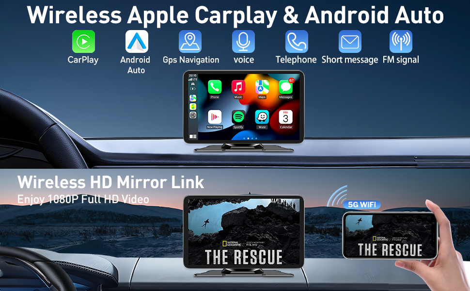【أحدث Carplay اللاسلكي وAndroid Auto لعام 2025】ستيريو السيارة المحمول يدعم Carplay اللاسلكي وAndroid Auto. ما عليك سوى الاتصال بهاتفك الذكي عبر Bluetooth وWiFi، مما يسهل عليك استخدام الوظائف الأساسية مثل التنقل عبر الخرائط والمكالمات الهاتفية والبريد الإلكتروني والرسائل والموسيقى أثناء السير على الطريق. كما أنه يدعم التحكم الصوتي عبر Siri أو Google Assistant، مما يحرر يديك للتركيز على القيادة الآمنة!