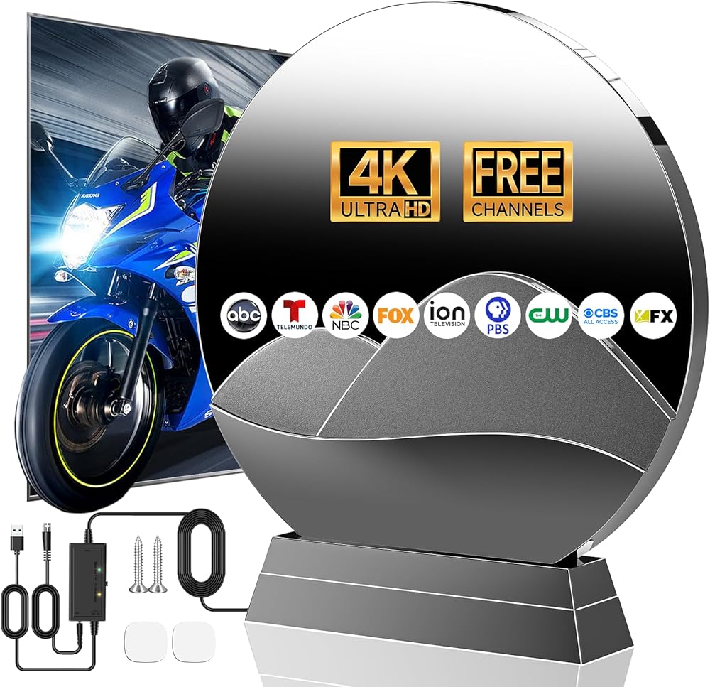 هوائي تلفزيون 2026 داخلي، هوائي رقمي يزيد عن 3600 ميل للتلفزيون الذكي الداخلي والخارجي، هوائي HDTV للقنوات المحلية مع معزز إشارة مضخم يدعم استقبال 360 درجة 4K 8K 1080P-38ft كابلات