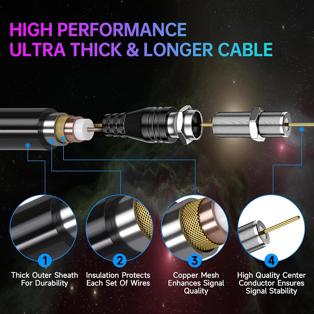 • كابل محوري ممتاز بطول 38 قدمًا: هوائي التلفزيون الداخلي هذا مجهز بكابل محوري ممتاز بطول 38 قدمًا، يتميز بنواة نحاسية خالية من الأكسجين بنسبة 99% وتصميم حماية ثلاثي الطبقات، مما يضمن نقل إشارة ثابت. علاوة على ذلك، يسمح لك الكابل الطويل للغاية باختيار أفضل موقع للتثبيت بحرية - سواء تم تعليقه على الحائط، أو وضعه بجوار النافذة، أو وضعه على الطاولة أو تثبيته في الخارج، يمكن تحقيق ذلك بسهولة