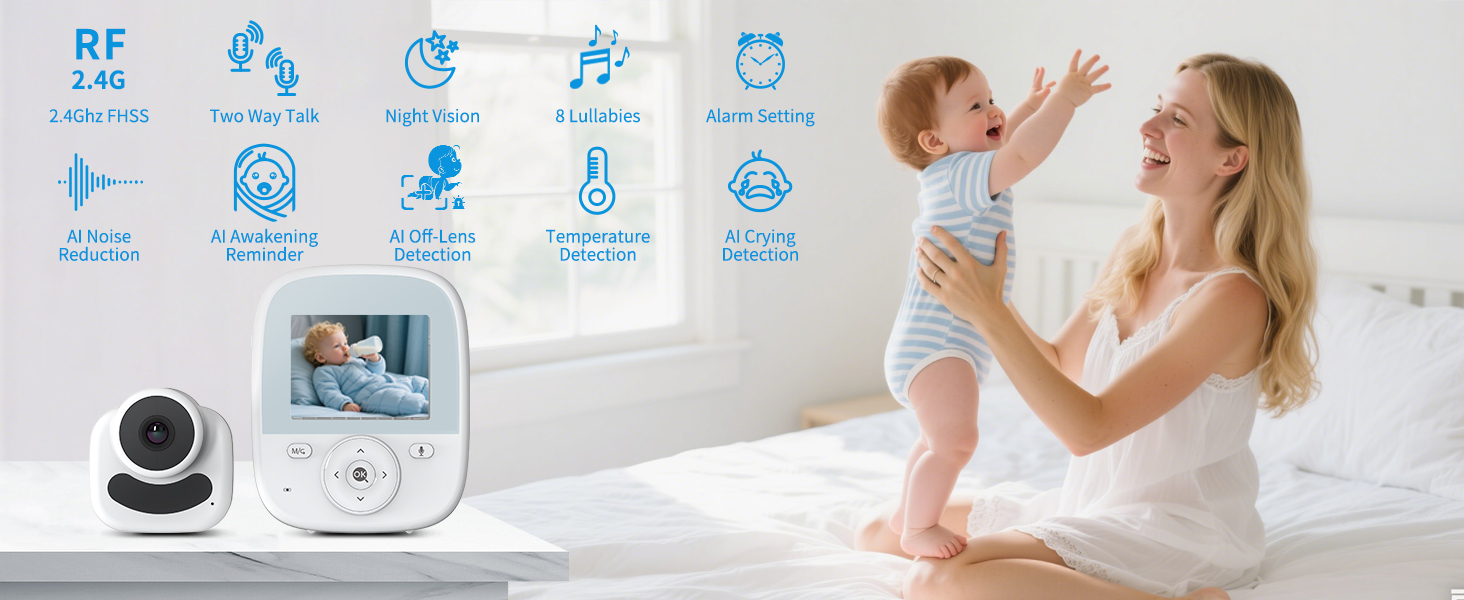 اكتشاف العدسات الخارجية وتذكير الاستيقاظ: عندما يستيقظ الطفل من النوم، سيذكرك من خلال جهاز مراقبة الطفل بغض النظر عن مكان وجودك. عندما يترك الطفل نطاق الشاشة، سيذكرك أيضًا بضمان سلامة الطفل