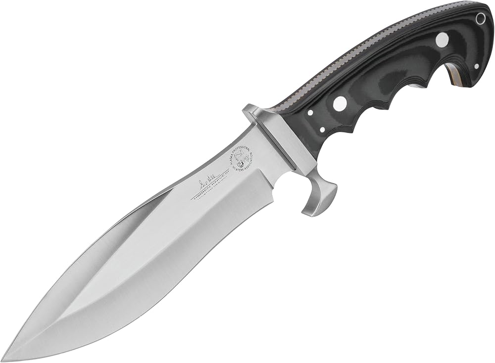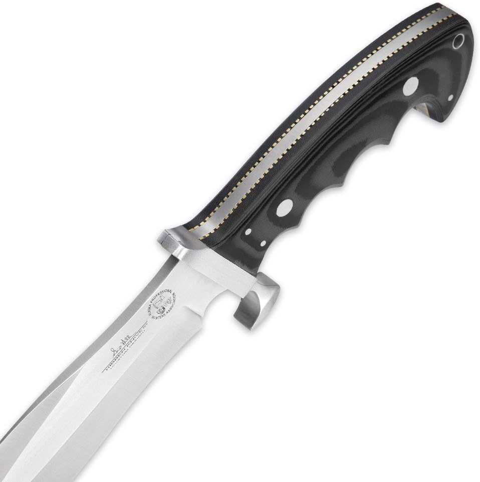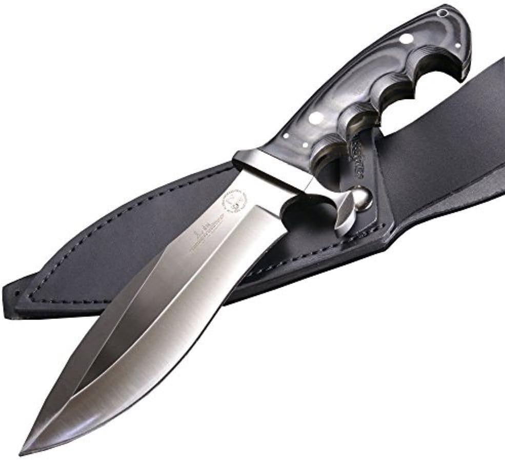 12 1/4" Overall. 6 7/8" Stainless blade. Full tang. Blade is fluted along the back. Black Spanish Micarta handles with stainless steel guard. Lanyard hole. Black leather belt sheath.
