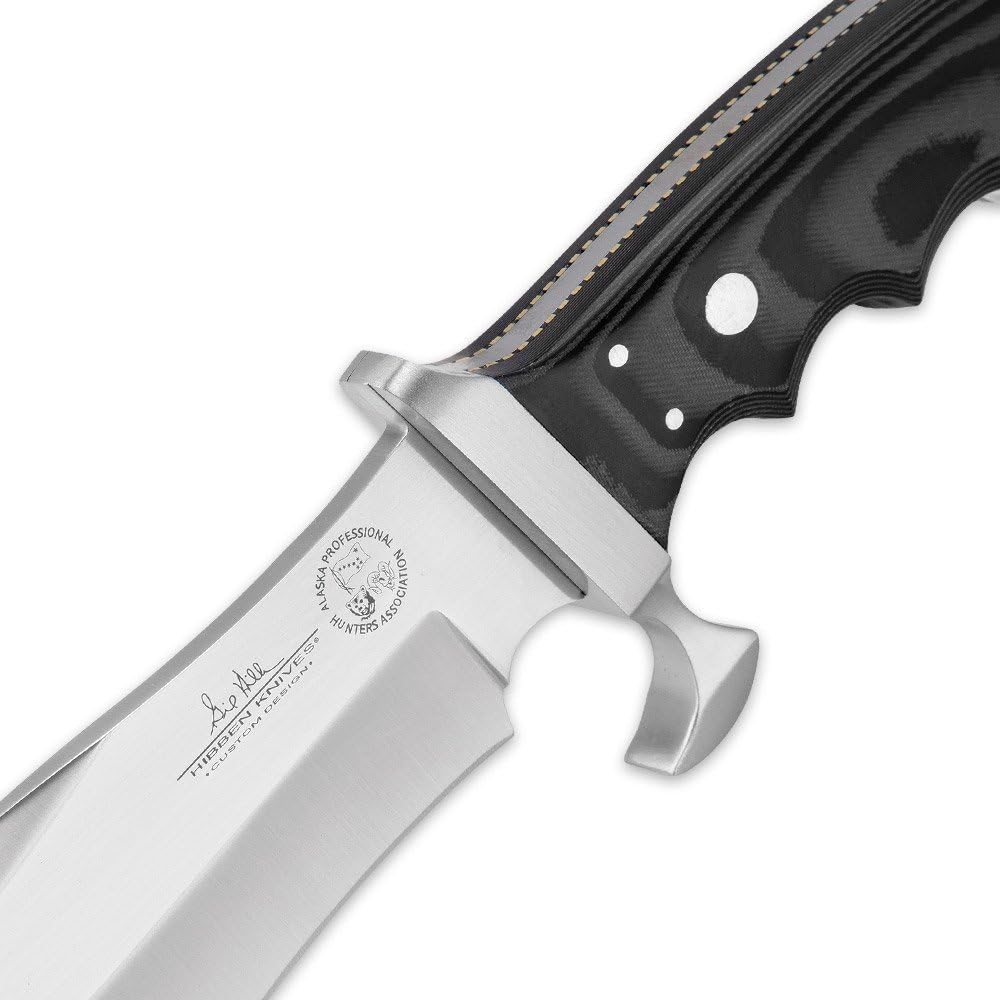 سكين البقاء على قيد الحياة من جيل هيبين ألاسكا مع غمد - شفرة من الفولاذ المقاوم للصدأ محفورة بالليزر، مقبض ميكارتا أسود، غمد من الجلد الطبيعي - سكين متعدد الأغراض للرياضة - إجمالي 12 1/4 بوصة