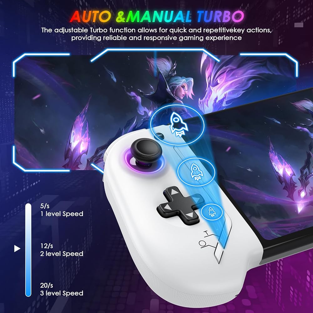 • 【تصميم مريح بالحجم الكامل‌ وإضاءة RGB غامرة】يوفر قبضة مريحة بينما يسمح لك بالتحكم في اللعبة دون عناء. قم بتخصيص أجواءك باستخدام مصابيح LED بعصا التحكم ذات 8 ألوان و3 أوضاع ديناميكية (ثابت/تنفس/وامض). بالإضافة إلى ذلك، يمكنك مشاركة لقطة الشاشة فورًا بنقرة واحدة لمضاعفة متعة اللعب.