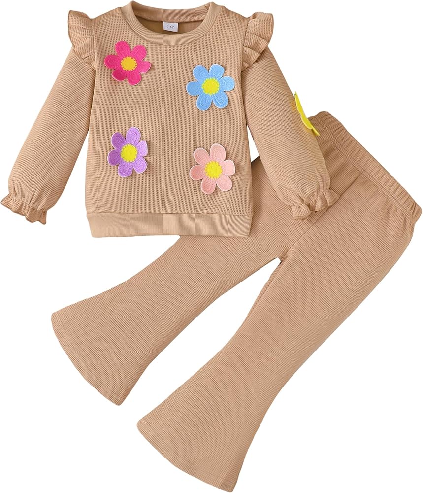 العبوة تشتمل على: 1 × سترة بأكمام طويلة مكشكشة مع زهور ثلاثية الأبعاد مضحكة. 1 × بنطال أنيق بلون موحد.