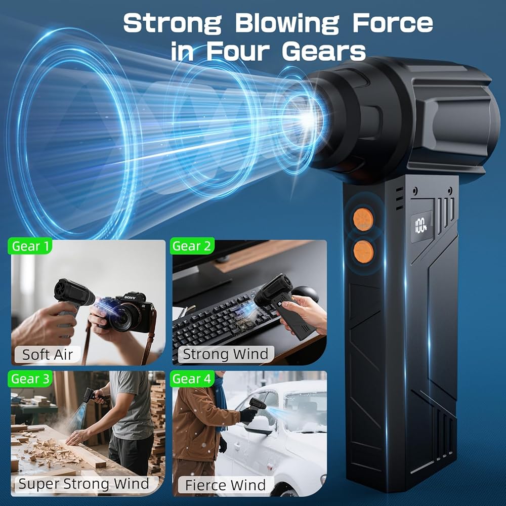 【شحن سريع لمدة 2.5 ساعة و4 مستويات للرياح】باستخدام كابل من النوع C، يمكن شحن منفضة الغبار بالهواء المضغوط بالكامل خلال 2.5 ساعة فقط (تيار مستمر 5 فولت/3 أمبير). 4 مستويات مختلفة للرياح، استمتع بما يصل إلى 90 دقيقة من الاستخدام على أقل إعداد.
