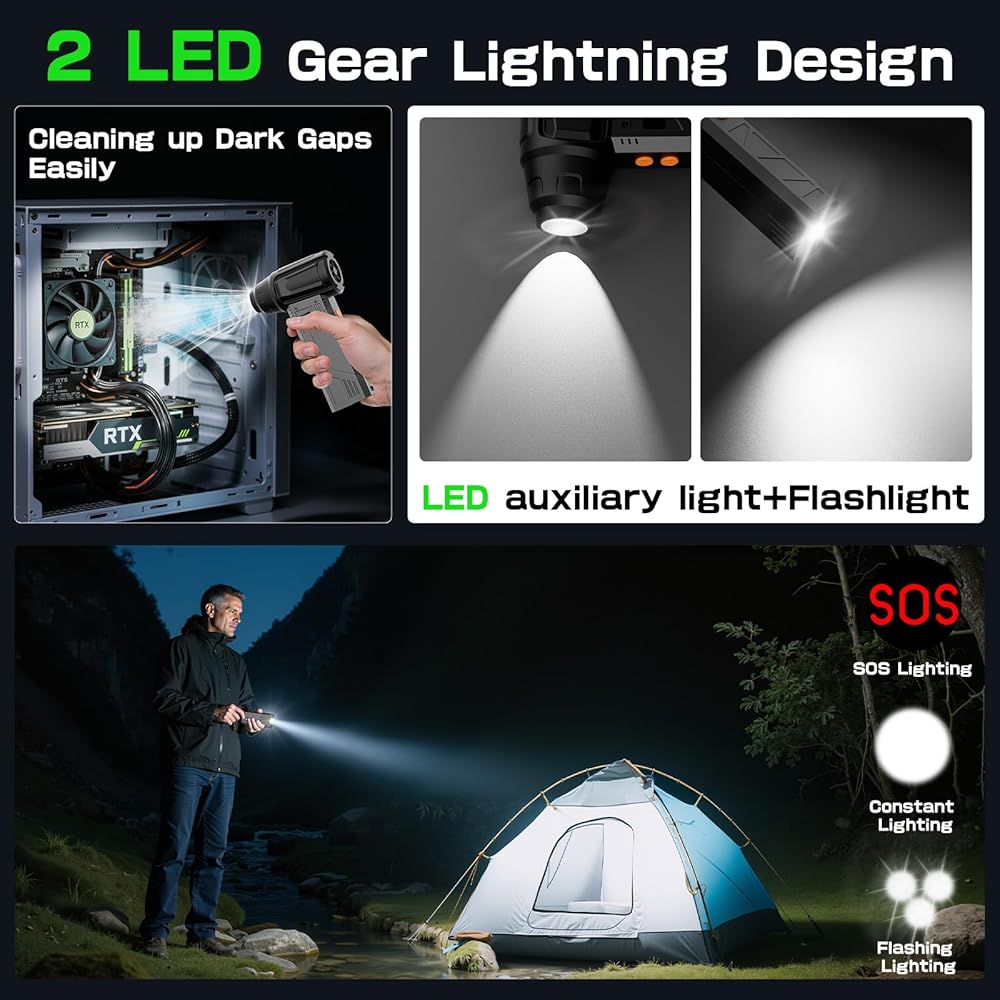 【مصباحان LED للاستخدام متعدد الأغراض】يجعل الضوء المساعد LED المدمج في منفضة الهواء المضغوط عملية التنظيف أمرًا سهلاً، ويأتي مع مصباح يدوي في الأسفل. مزود بمصباح يدوي في الأسفل مع 3 أوضاع. كما أنه مثالي للاستخدام في المكاتب أو المنازل أو السيارات، مما يضمن لك الحفاظ على أجهزتك ومساحاتك خالية من الغبار أينما كنت.