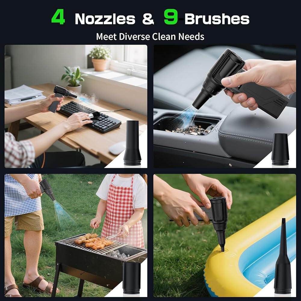 【 9 فرش و4 فوهات استخدام متعددة الأغراض】تتضمن مجموعة غبار الهواء الكاملة 4 أحجام مختلفة من فوهة النفخ وفوهة الإزالة، ويمكن استخدامها للوحة المفاتيح والكمبيوتر والأريكة والفتات وإزالة السيارة وتهوية حمام السباحة. تعمل الفرش التسعة معًا لسهولة التنظيف والتلميع والوصول إلى المساحات الضيقة. لا حاجة لشراء أدوات إضافية، من السهل العناية بجميع الفوضى.