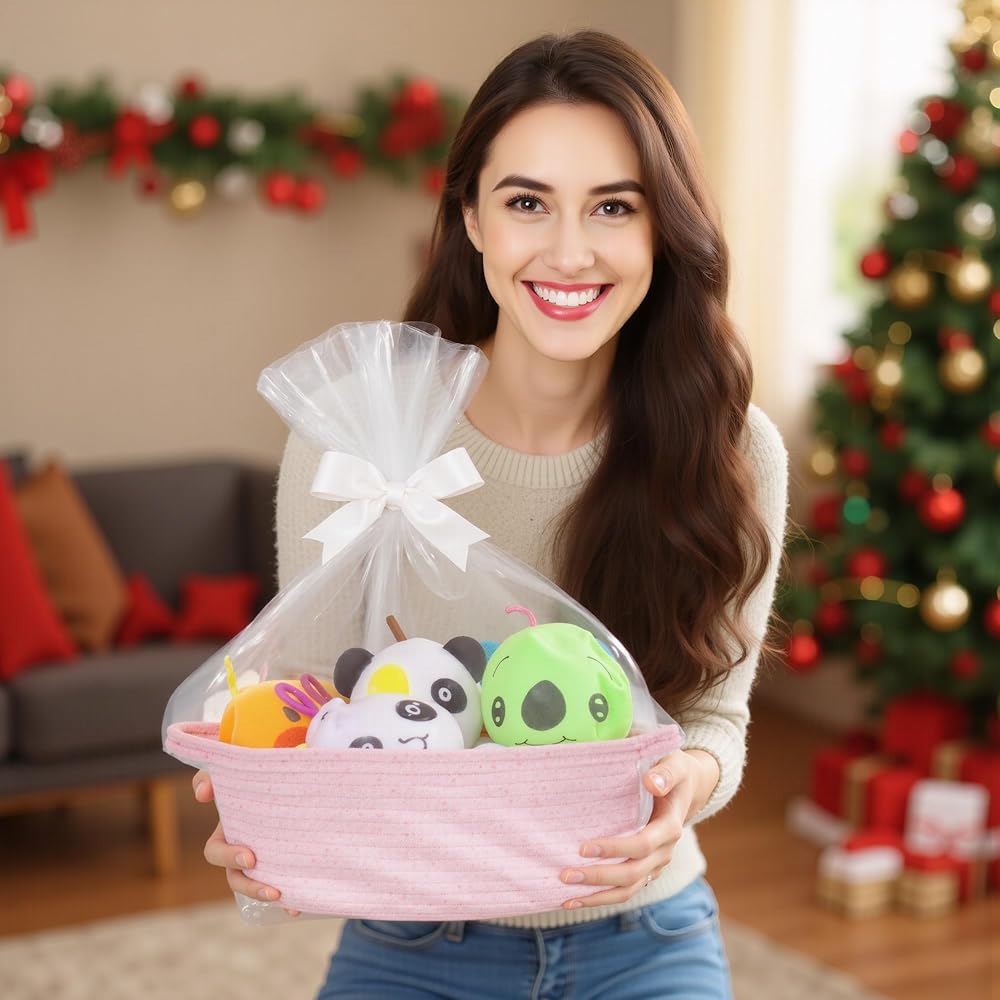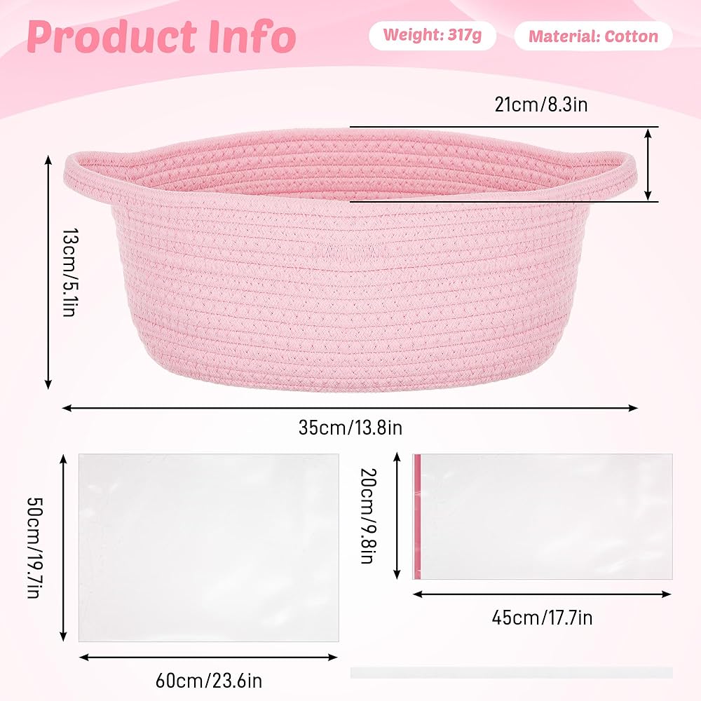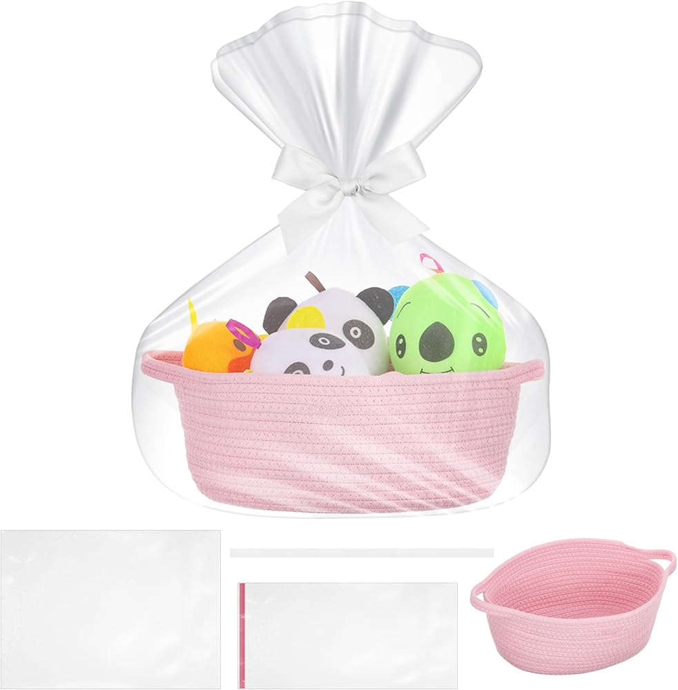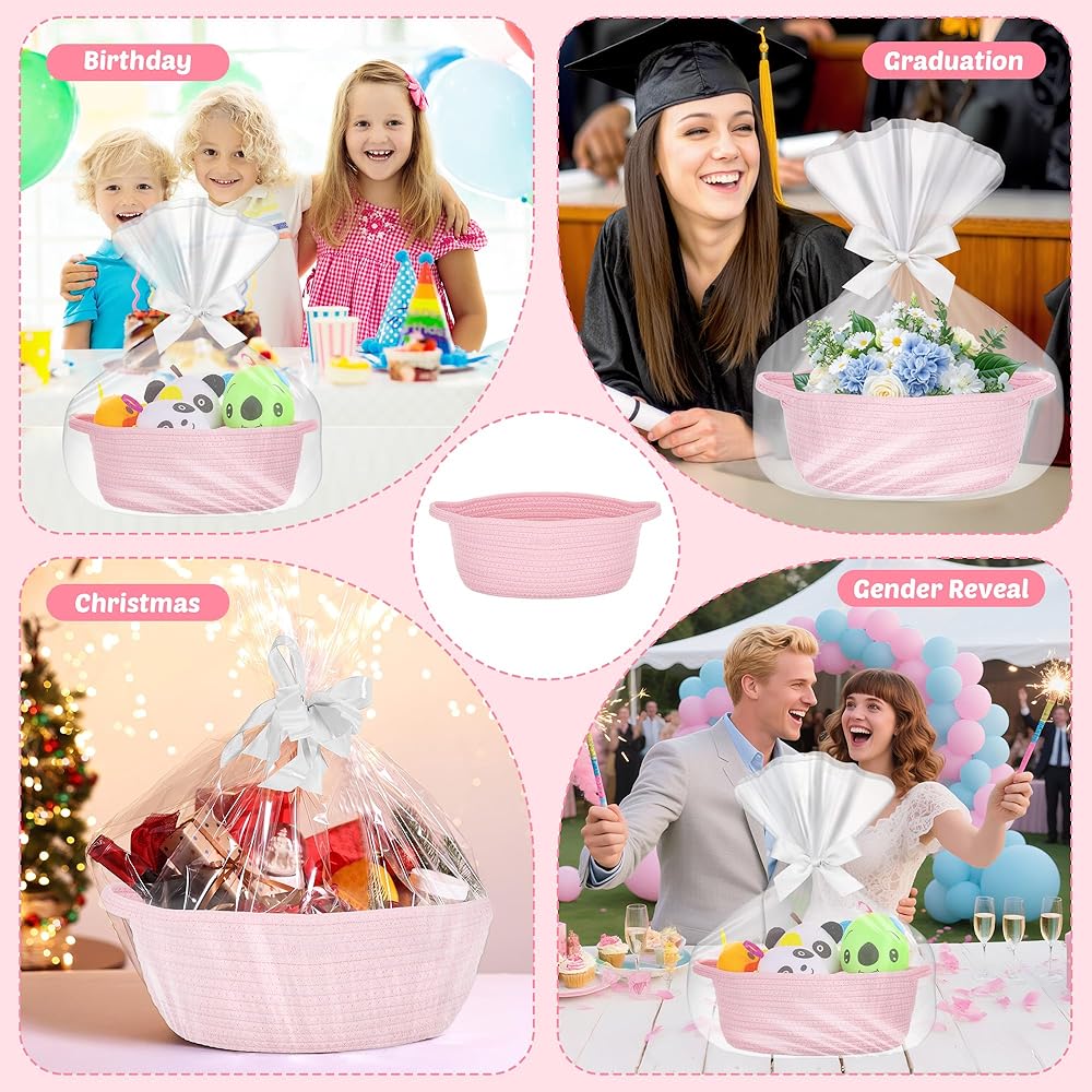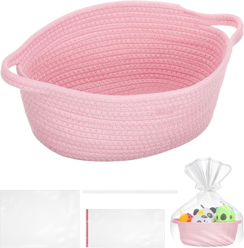 سلة منسوجة صغيرة مع أكياس هدايا وأشرطة، سلال متينة للهدايا الفارغة، سلة من الحبال لتخزين سلال ألعاب الأطفال بمقابض (وردي)