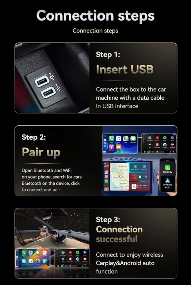 【ميزة الاتصال المستقر】: يعمل محول السيارة اللاسلكي الذي يعمل بنظام Android على التخلص من المشكلات الناجمة عن كسر الكابل وانقطاع الاتصال بسبب الحركة على الطرق الوعرة. ما عليك سوى التوصيل والتشغيل للتنشيط التلقائي لاتصال Carplay / Android Auto اللاسلكي في كل مرة تقوم فيها بتشغيل سيارتك.