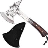فأس التخييم مع غمد من النايلون، فأس توماهوك فايكنغ محفور برأس ذئب من الفولاذ المقاوم للصدأ مع قبضة خشبية كاملة تانغ، فأس تخييم لتقسيم الخشب في الهواء الطلق، والبقاء على قيد الحياة، والأنشطة الزراعية (فأس الذئب)