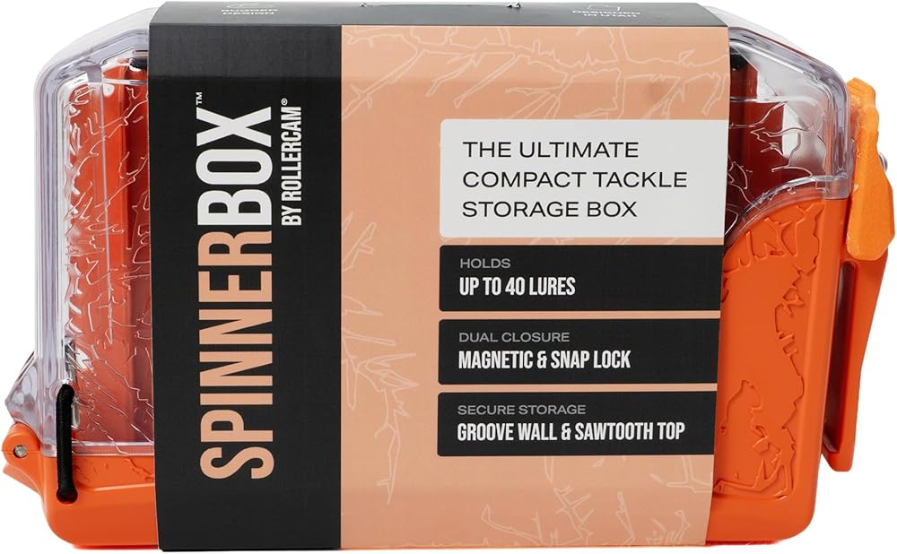 صندوق تخزين صغير الحجم من Rollercam SpinnerBox - يحمل ما يصل إلى 40 طُعمًا - مغناطيسي + قفل سريع - منظم صندوق معالجة بغطاء شفاف للغزالين والملاعق والطعوم الصغيرة - صندوق أدوات صغير متين لصيد الأسماك