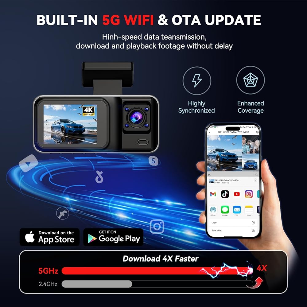 كاميرا داش كام 4K مع 5 جيجاهرتز واي فاي والتحكم في التطبيق، 4K+1080P+1440P داش كام أمامية وخلفية من الداخل مع بطاقة 64 جيجابايت، كاميرا داش للسيارات ذات الرؤية الليلية، تسجيل حلقة، وضع ركن السيارة 24 ساعة، مستشعر G