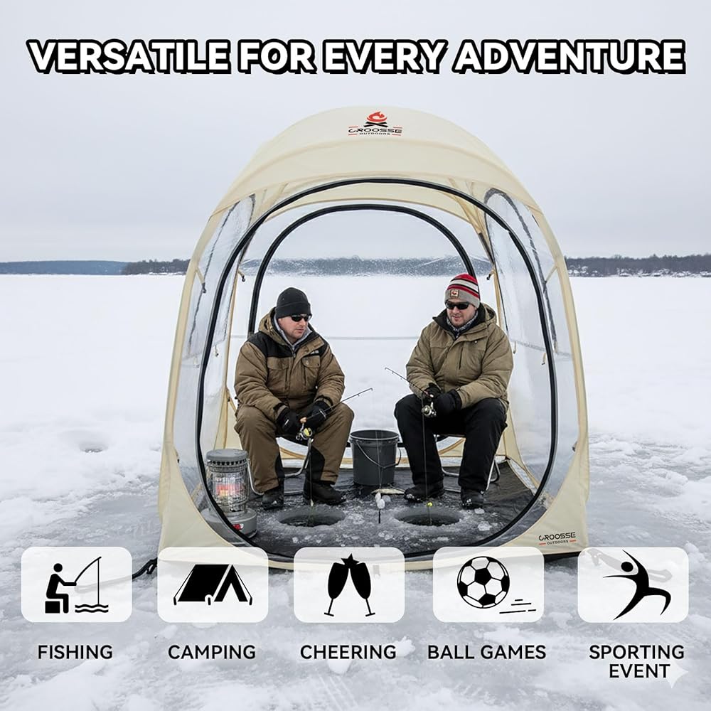 غرفة واسعة للراحة والاسترخاء: تم تصميم هذه الخيمة الرياضية الخارجية مع وضع الراحة في الاعتبار، وتتميز بمساحة داخلية واسعة تبلغ 55 بوصة × 55 بوصة × 63 بوصة وتناسب بشكل مريح شخصين. توفر بصمتها المحسنة مساحة قابلة للاستخدام أكثر من الخيام المزدوجة التقليدية، مما يضمن تجربة أقل تضيقًا وأكثر متعة. تحتوي على بابين ونافذتين لسهولة الوصول وتدفق هواء فائق. عند تخزينها بعيدًا، تخلق الأبواب والنوافذ رؤية بانورامية نظيفة - مثالية لمشاهدة الأحداث مثل الميدان الهوكي