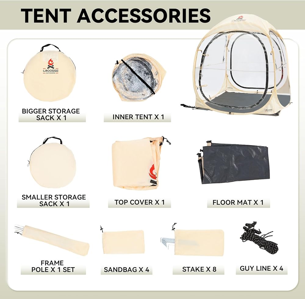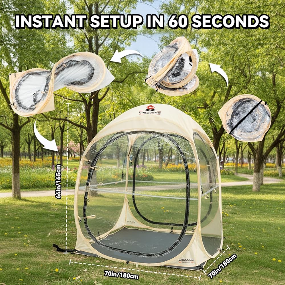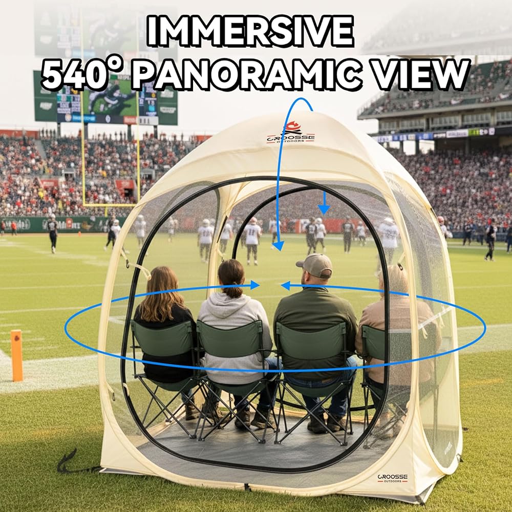 رؤية بانورامية غامرة بزاوية 540 درجة: استمتع بتجربة بصرية دون عائق مع خمسة جوانب PVC شفافة تمامًا توفر بانوراما حقيقية بزاوية 540 درجة. إنه الملاذ المثالي لمشاهدة الأحداث الرياضية أو الأفلام الخارجية دون فقدان أي من الأحداث. نصيحة سريعة: أي تجاعيد ناتجة عن الطي سوف تنعم بشكل طبيعي بعد التهوية مع فتح الأبواب والنوافذ لمدة ساعة إلى ساعتين
