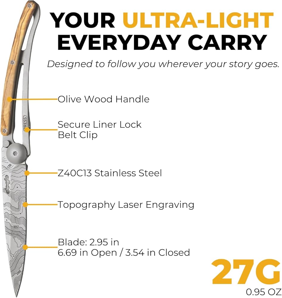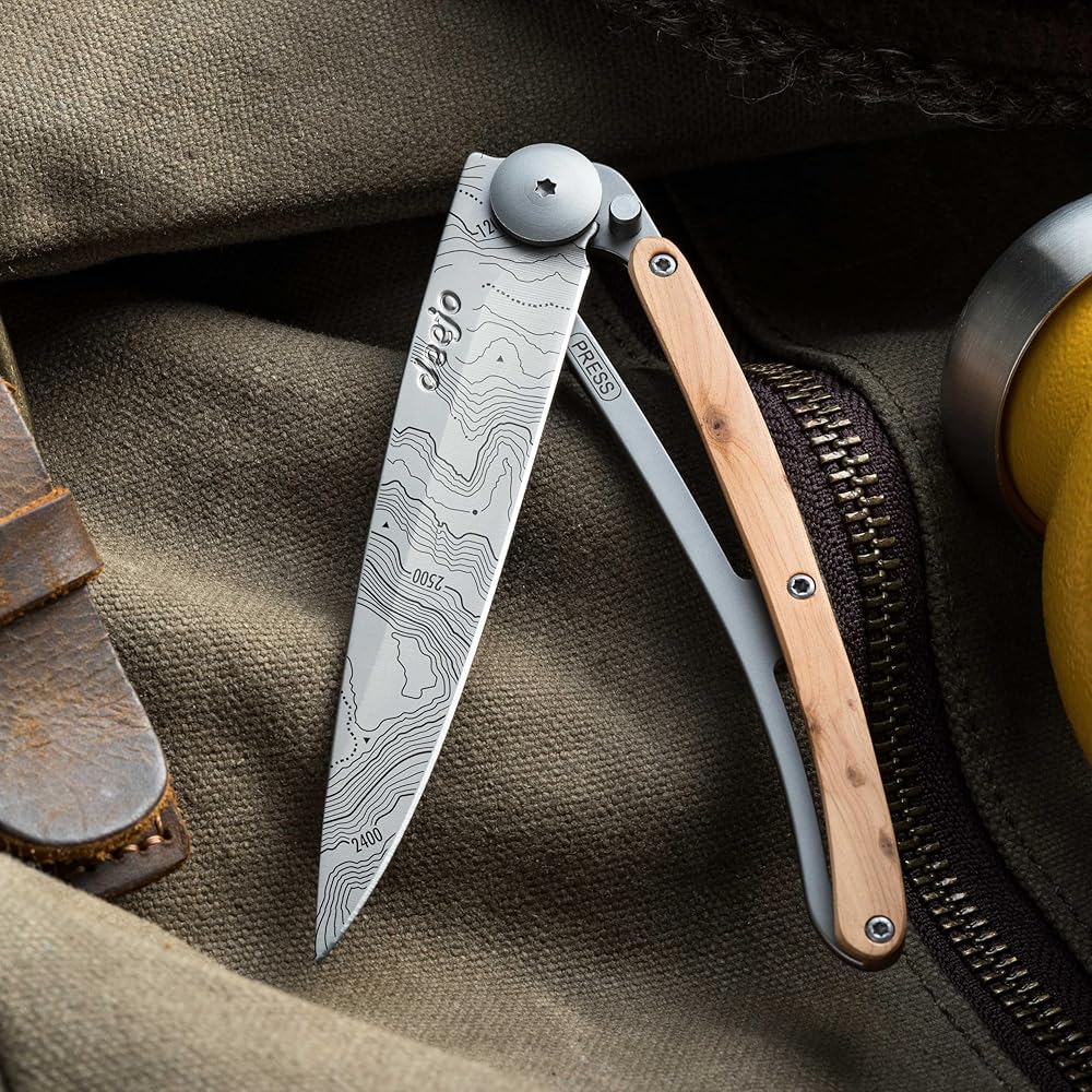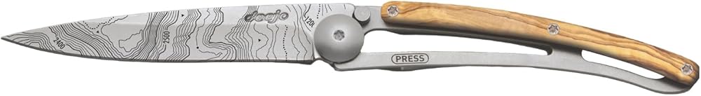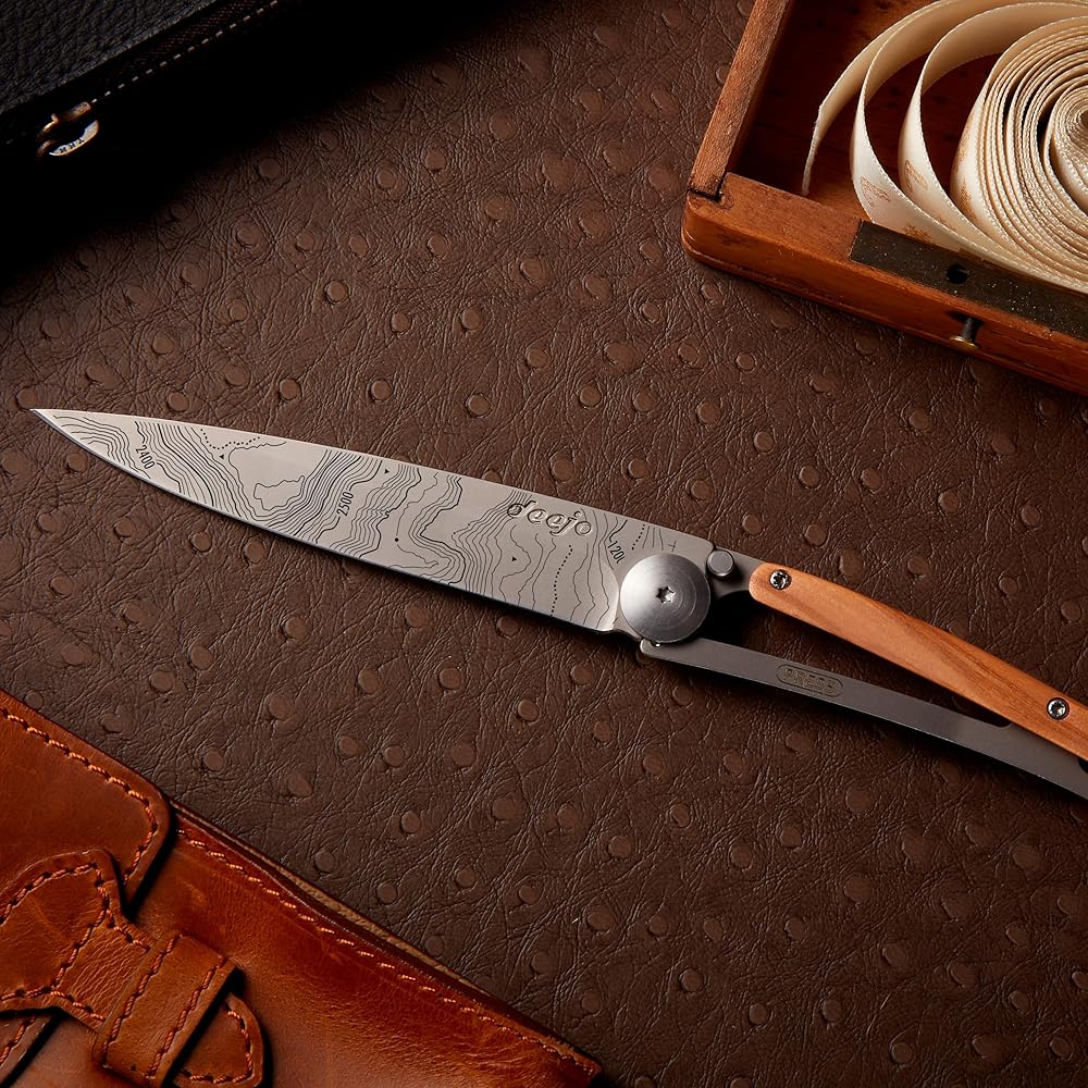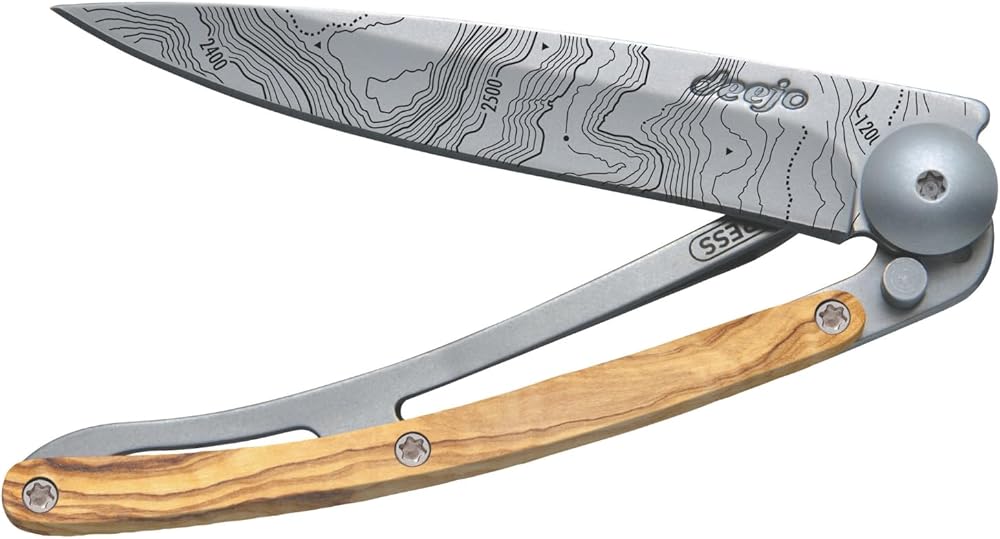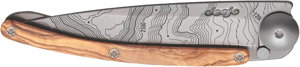 deejo - سكين جيب قابل للطي 27 جرام مع مشبك حزام - تصميم طبوغرافي، شفرة من الفولاذ المقاوم للصدأ مقاس 2.95 بوصة، مقبض من خشب الزيتون - خفيف الوزن للحمل اليومي للمنزل والعمل والاستخدام الخارجي