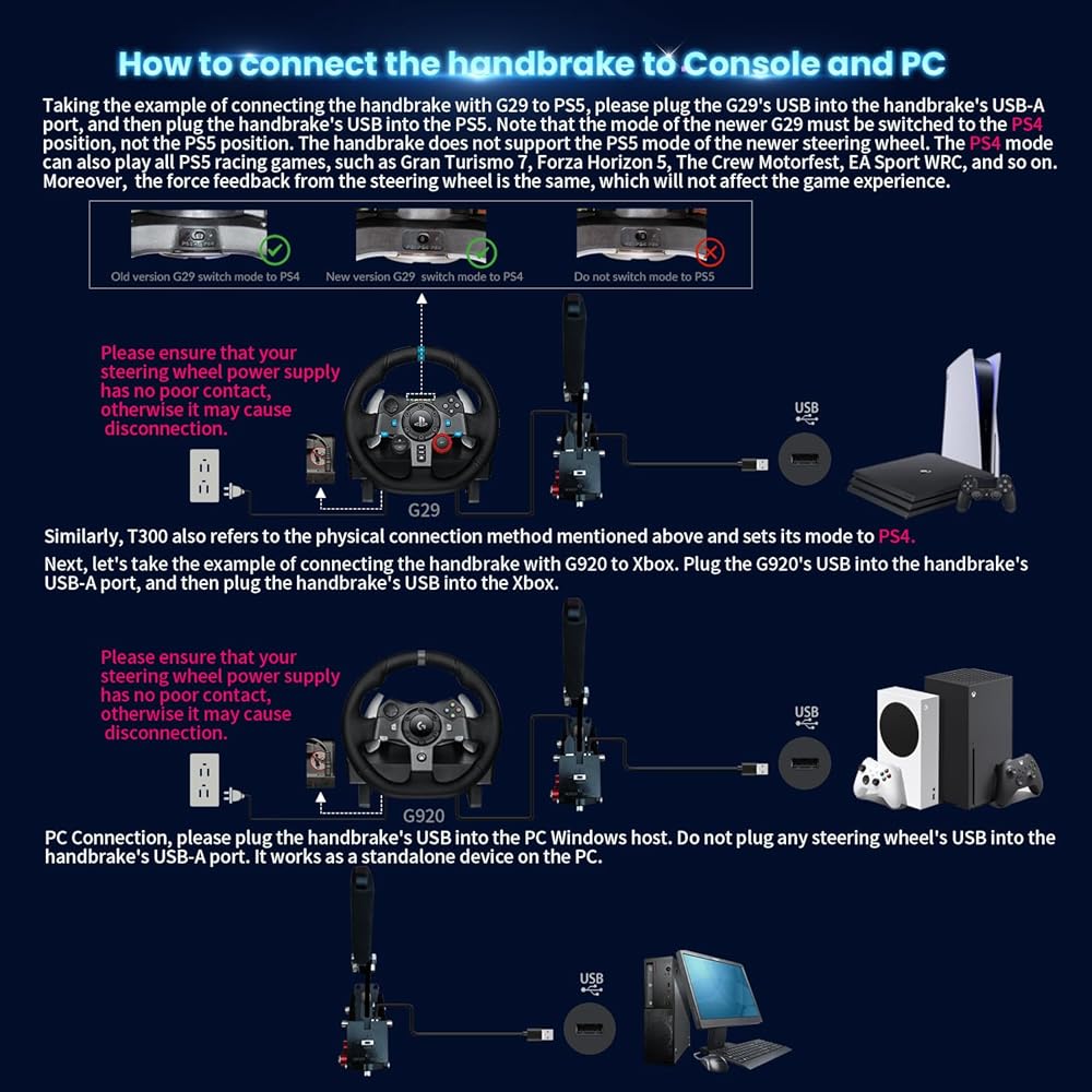 اتصال وحدة التحكم: يرجى توصيل USB الخاص بعجلة القيادة بمنفذ USB-A الخاص بفرامل اليد، ثم قم بتوصيل USB الخاص بفرامل اليد بجهاز PS/Xbox. وفي الوقت نفسه، يحتاج جهاز G29 الأحدث إلى تبديل الوضع إلى وضع PS4 بدلاً من وضع PS5. لا تدعم فرامل اليد وضع PS5، ولكن لا يزال من الممكن تشغيل جميع ألعاب سباقات PS5 في وضع PS4.