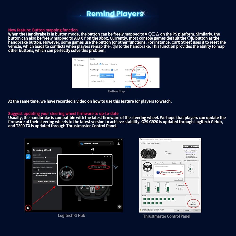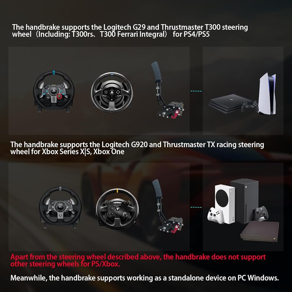 توافق متعدد المنصات: تدعم فرامل اليد عجلة القيادة Logitech G29 وThrustmaster T300RS (بما في ذلك: T300RS GT، T300 Ferrari) لجهاز PS4/PS5، كما تدعم عجلة القيادة Logitech G920 وThrustmaster TX لأجهزة Xbox Series X|S وXbox One. بالإضافة إلى ذلك، فرملة اليد غير مدعومة لعجلات القيادة الأخرى على PS/Xbox.