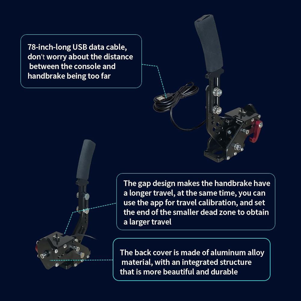 مادة معدنية: فرامل اليد مصنوعة من مادة سبائك الألومنيوم، وهي خفيفة الوزن وقوية وقوية. بالإضافة إلى ذلك، تم تجهيز فرامل اليد بمشبك من الفولاذ المقاوم للصدأ، والذي يمكن تكييفه مع قمرة القيادة المختلفة لسباقات sim لمزيد من الراحة.