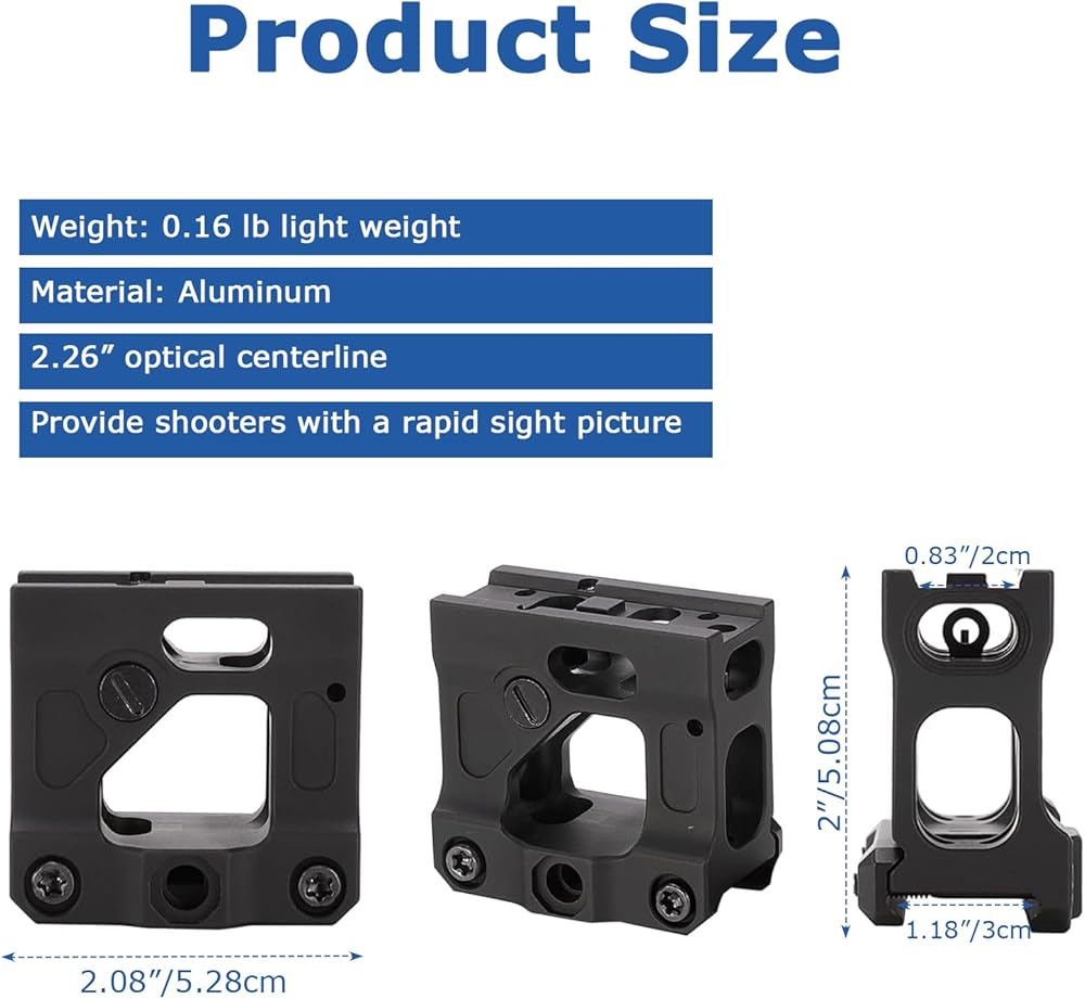 Made of aluminum, it is compatible with T1, T2, H1, H2, RomeO and CompM5.