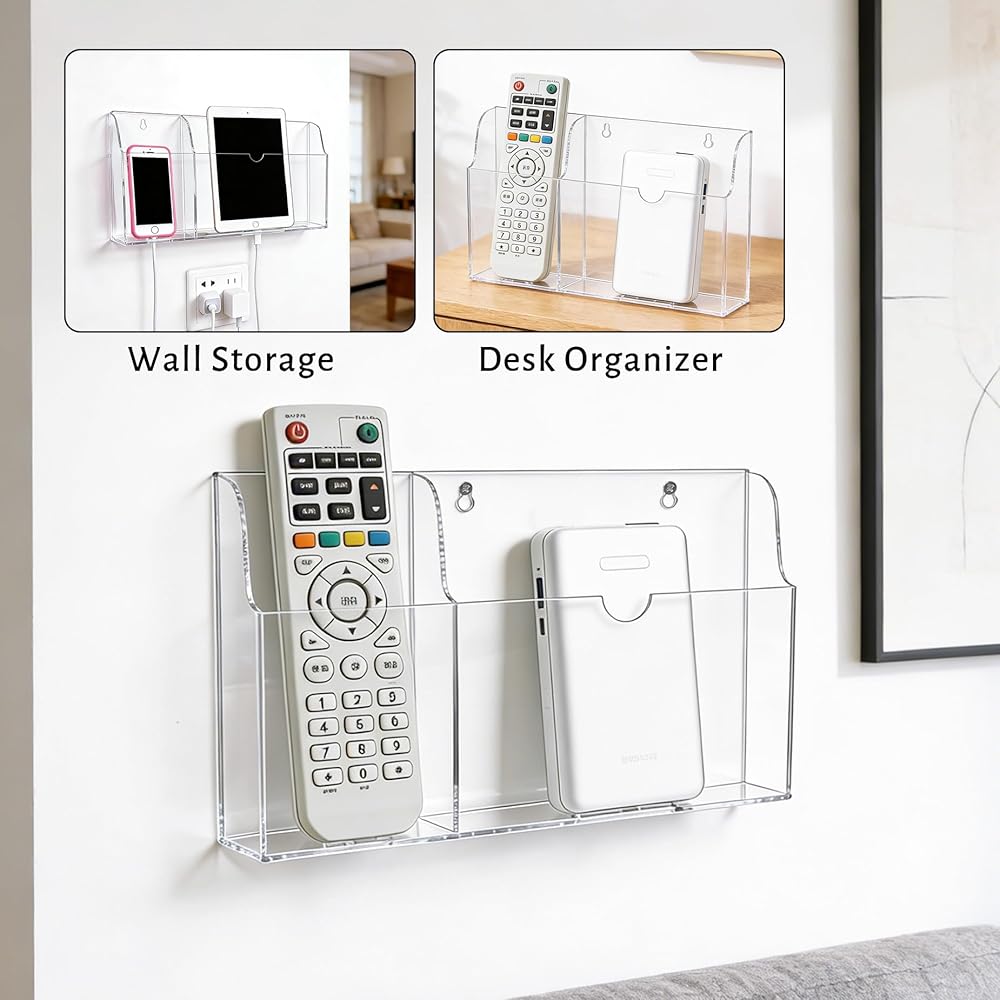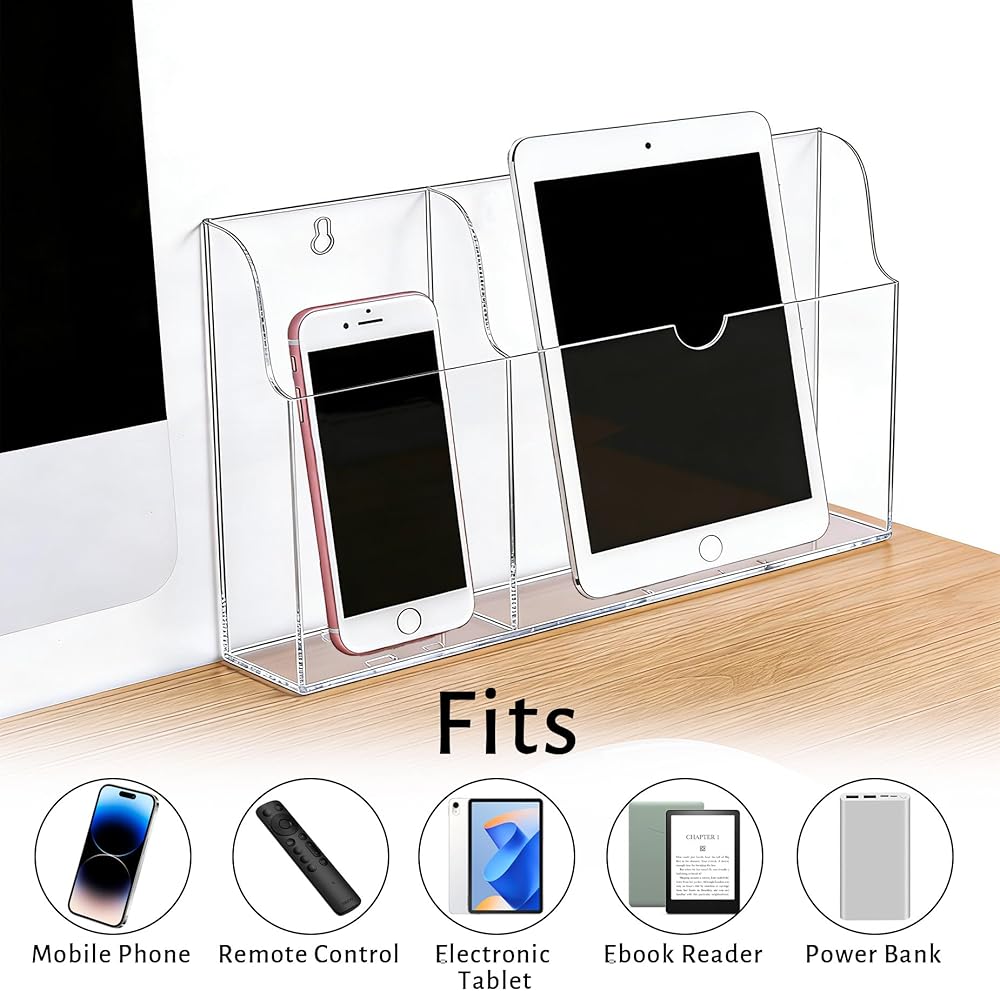 Legrape Acrylic Wall Mounted Phone Holder, Tablet Wall Mount with Charging Holes, 2 Slots Wall Remote Control Holder for iPad Kindle Laptop