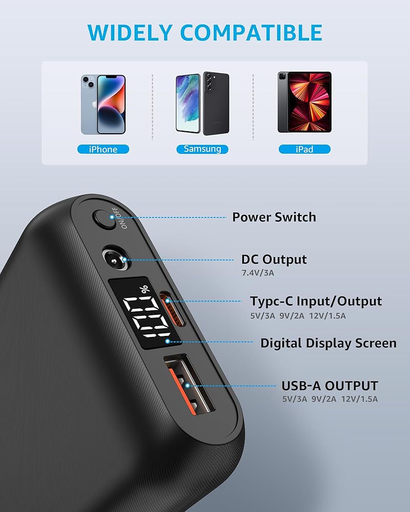 • بطارية مصممة خصيصًا للسترات الساخنة: تم تصميم بنك الطاقة 7.4 فولت 3 أمبير خصيصًا للسترات الساخنة والسترات الساخنة والسراويل الساخنة. تحتوي بطارية السترة المُسخنة على منفذي إخراج، 7.4 فولت تيار مستمر، وهي متوافقة مع معظم الملابس المُسخنة 7.4 فولت في السوق. (ملاحظة: متوافقة مع ملابس ORORO المُسخنة، لا تناسب جهاز 12 فولت/ جهاز مُسخن) حزمة بطارية السترة المُسخنة 16000 مللي أمبير 7.4 فولت مناسبة أيضًا لمعظم الهواتف الذكية