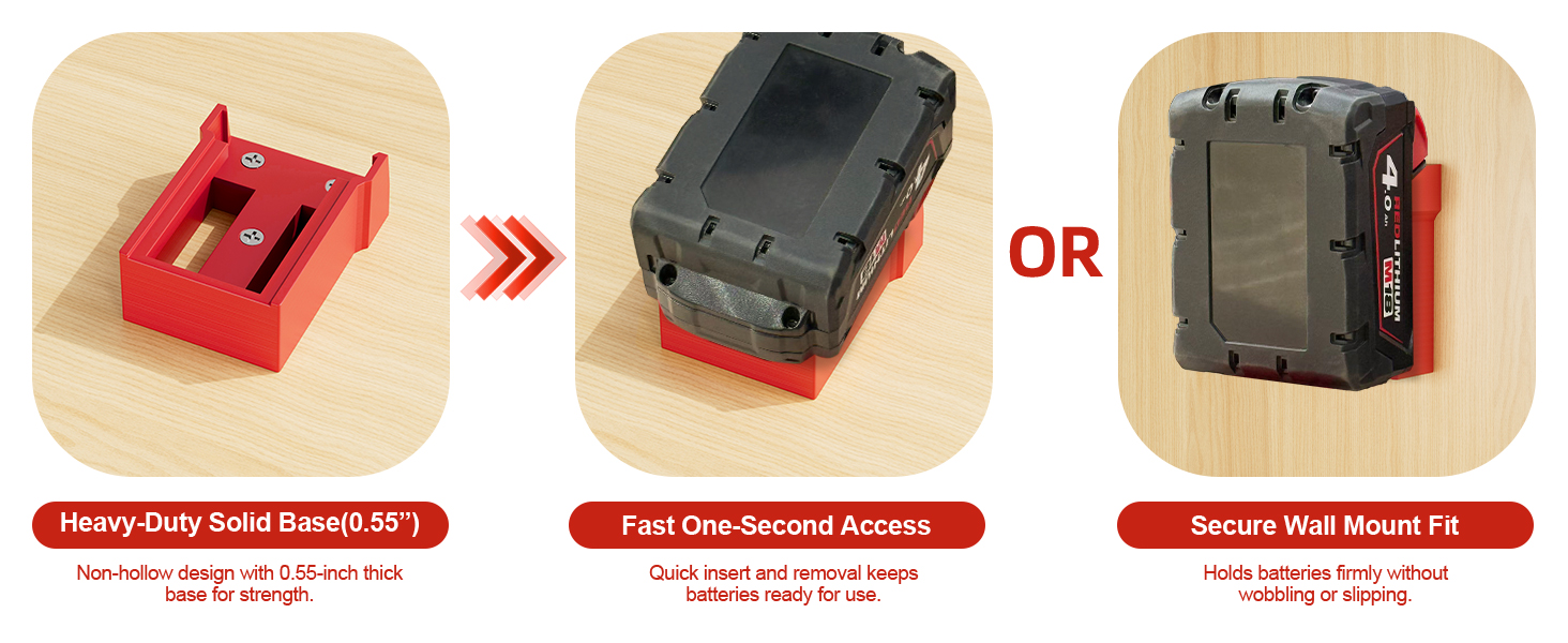 تخزين البطارية سريع الوصول، تصميم الإدخال والإزالة لمدة ثانية واحدة يحافظ على بطاريات M18 آمنة ومرئية وجاهزة. يقلل من الفوضى ويحمي البطاريات أثناء الاستخدام اليومي.
