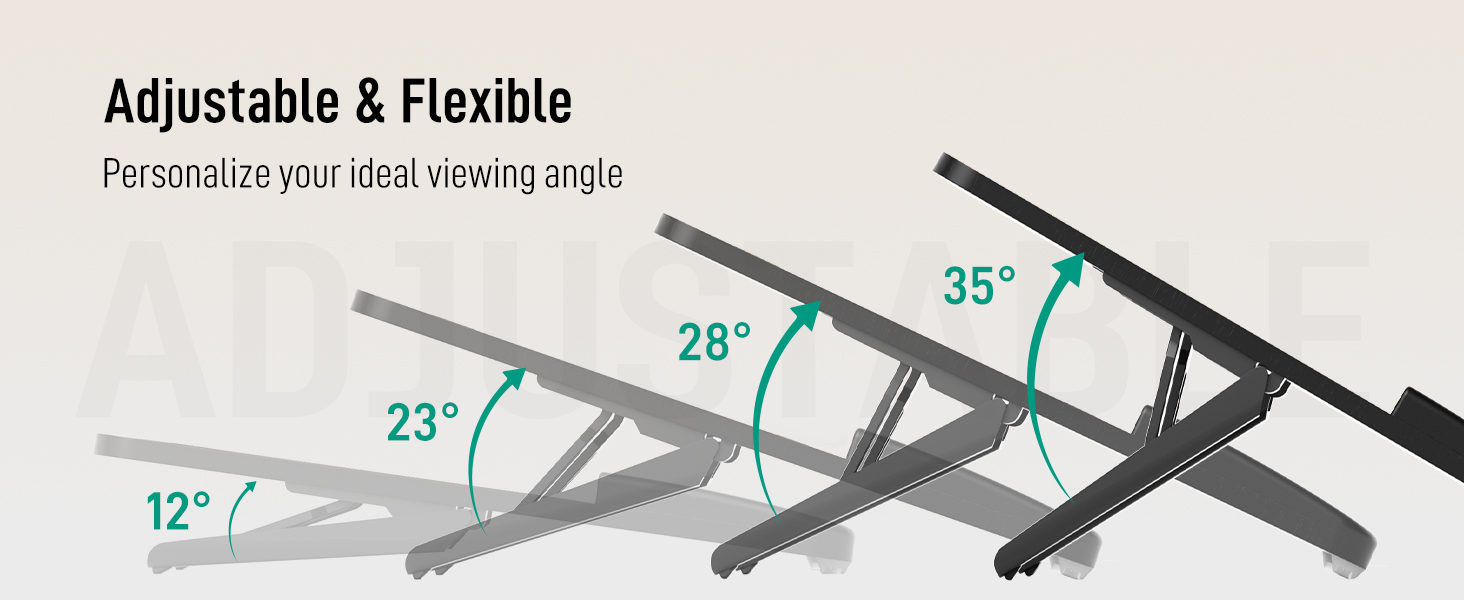تصميم مريح ذو 5 زوايا: يوفر 5 زوايا قابلة للتعديل لاختيار الوضع المفضل لديك، مما يرفع الكمبيوتر المحمول إلى مستوى عرض مريح. يساعد على تصحيح وضعية الجلوس، ويخفف بشكل فعال آلام الرقبة والكتف من الاستخدام طويل الأمد، ويعزز راحة العمل/الدراسة.