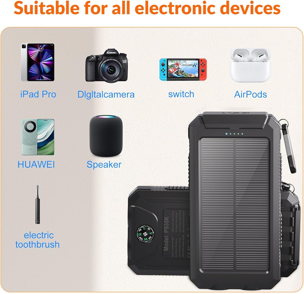 Charge 6 Devices Simultaneously 4 Cables & 3 Ports - This solar charge power bank features 3 built-in output cables (Type C, Lightning, and Micro USB) and 1 USB-A input cable, so you never need to carry extra cables. Enjoy hassle-free charging at home, work, or on the go. It also has various ports (Type-C In/Output Port & USB Output Port*2). Powering 6 devices at the same time, compatible with all iOS and Android users.