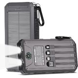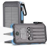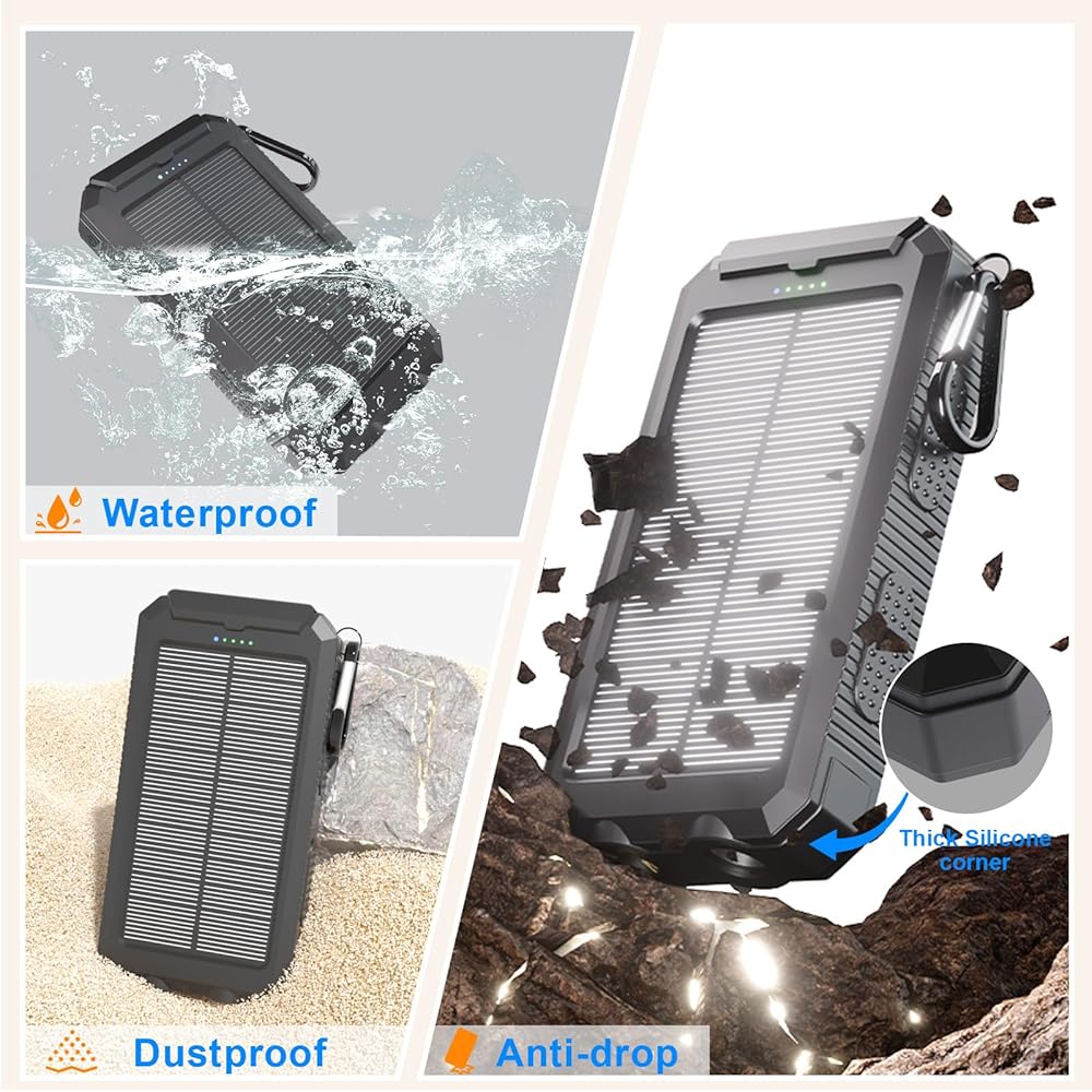 Durable outdoor essential: This solar portable charger is made of high-quality ABS+PC material, offering a sturdy and durable structure with waterproof, dustproof, and shockproof features. It can withstand harsh outdoor environments. The four corners of the mobile power bank are covered with thickened anti-fall silicone, and the charging port is protected by a silicone cover to prevent water ingress. Additionally, the included carabiner clip allows you to attach it to your gear or backpack for hands-free charging.
