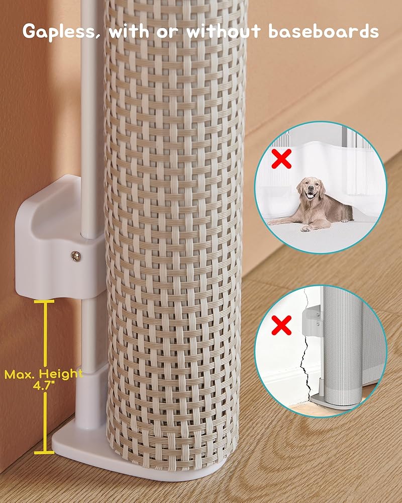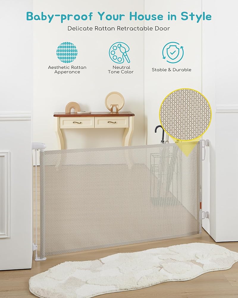بوابة أطفال قابلة للسحب، شبكة رائعة من الروطان، بطول 81.28 سم، وتمتد حتى عرض 137.16 سم، بوابة للكلاب للسلالم والمدخل والممر وسياج الحيوانات الأليفة الداخلي والخارجي، تصميم يمكن المرور من خلاله بدون شريط سفلي، بيج