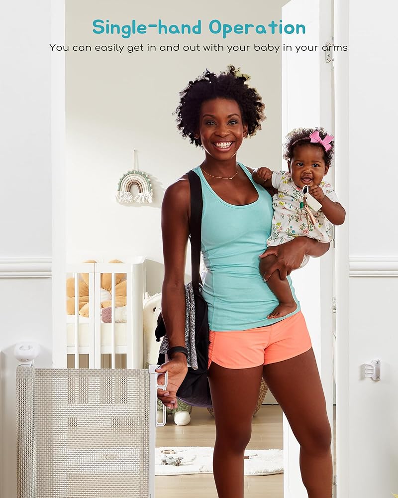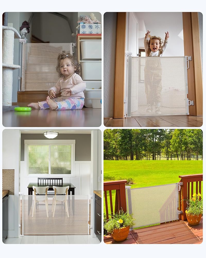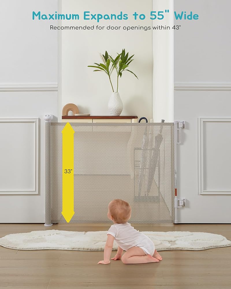 المناطق والأبعاد القابلة للتطبيق: يوصى ببوابة الأطفال التي يبلغ عرضها 55 بوصة وارتفاعها 33 بوصة لفتحات الأبواب في حدود 43 بوصة وتترك 11.8 بوصة من الشبكة لمزيد من الأمان. يمكن تركيب البوابة إما للداخل أو للخارج، مما يسمح لها بتناسب الفجوات المختلفة بين المداخل والممرات والمطابخ وأسفل السلالم والشرفات والساحات الخلفية.