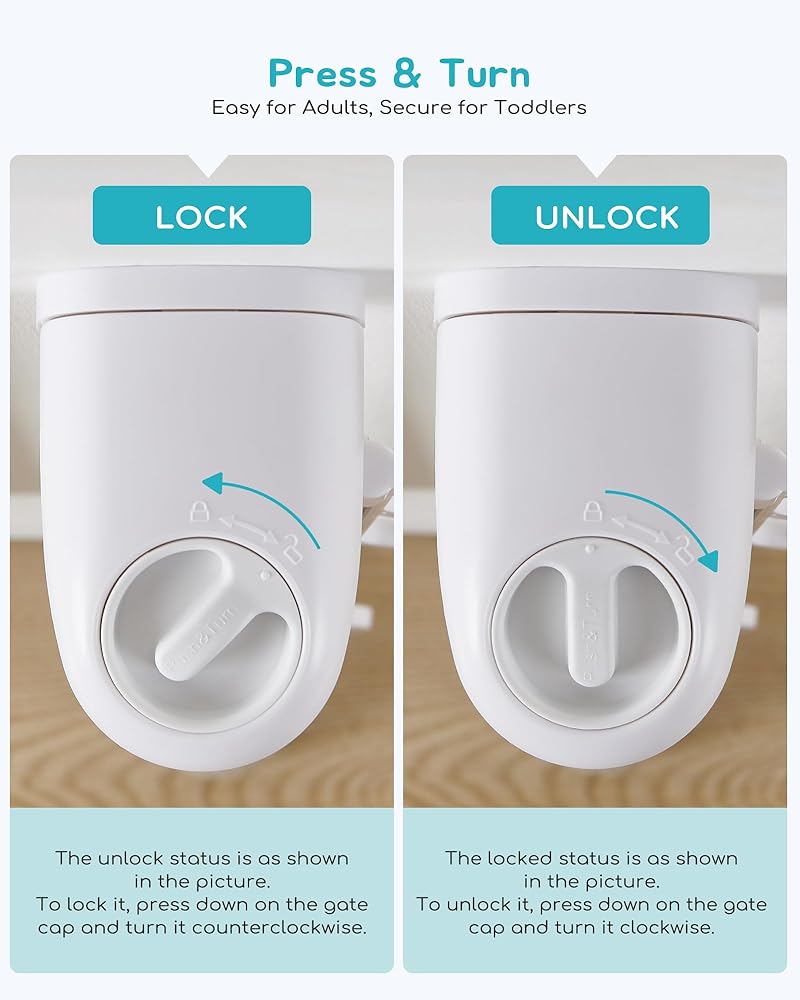 آلية القفل المزدوج، التشغيل بيد واحدة: اضغط بلطف وأدر غطاء البوابة لقفل أو فتح بوابة الأمان بسهولة بيد واحدة. هذه الميزة تجعل البوابة مريحة للغاية في الاستخدام، حتى عندما تحمل طفلاً أو تحمل الغسيل. آلية القفل المزدوج سهلة الاستخدام للبالغين وآمنة بما يكفي للأطفال الصغار.