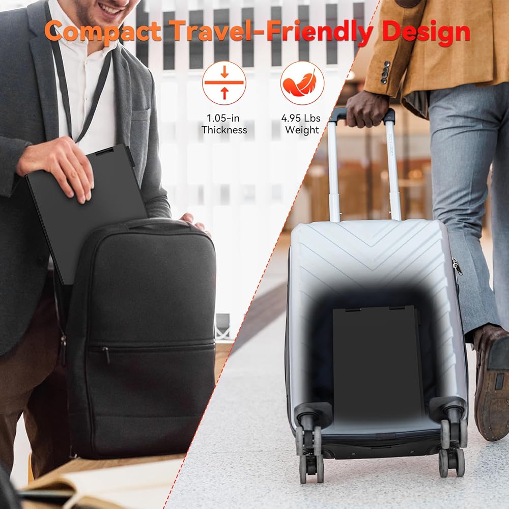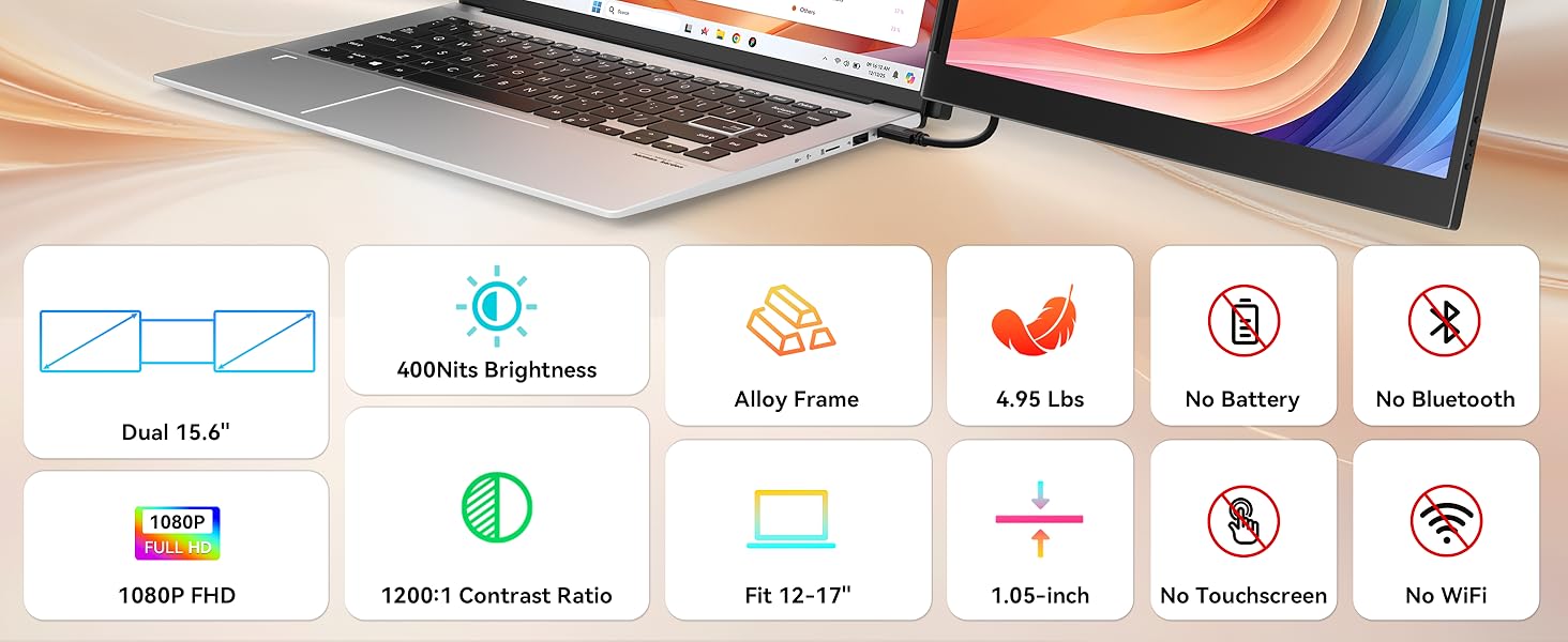 تصميم متين وقابل للتعديل من الألومنيوم - تم تصميم هذه الشاشة المحمولة المزدوجة بإطار أنيق من سبائك الألومنيوم، مما يوفر الثبات والأناقة. وعلى عكس موسعات الشاشة المثبتة بمشبك، يتم تثبيتها بشكل آمن خلف الكمبيوتر المحمول الخاص بك دون توصيلها بالشاشة، مما يزيل تلف الشاشة وقيود الارتفاع. يمنحك الدوران 240 درجة، والمسند 90 درجة، والقاعدة المطاطية غير القابلة للانزلاق التحكم الكامل في زاوية الرؤية الخاصة بك في أي إعداد.