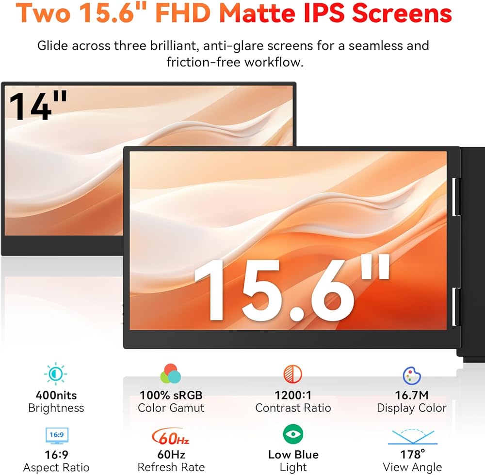 شاشات عرض FHD IPS مزدوجة نابضة بالحياة مقاس 15.6 بوصة - استمتع بمرئيات حادة وواقعية مع ألوان sRGB بنسبة 100% وسطوع 400 شمعة ونسبة تباين 1200:1. تتميز كل شاشة بقائمة OSD الخاصة بها لإجراء تعديلات مخصصة على RGB والحدة والتباين. تساعد تقنية الضوء الأزرق المنخفض والخالية من الوميض على تقليل إجهاد العين أثناء الجلسات الطويلة، بينما يعمل وضع الطاقة المنخفضة الاختياري على توفير الطاقة.