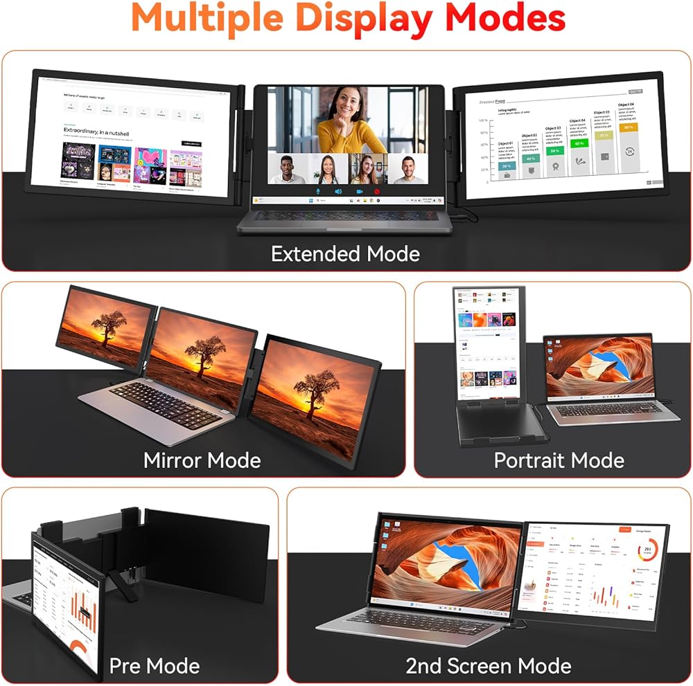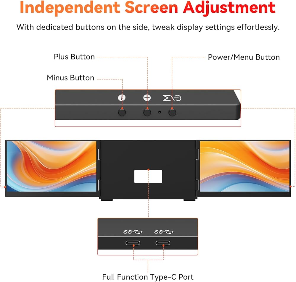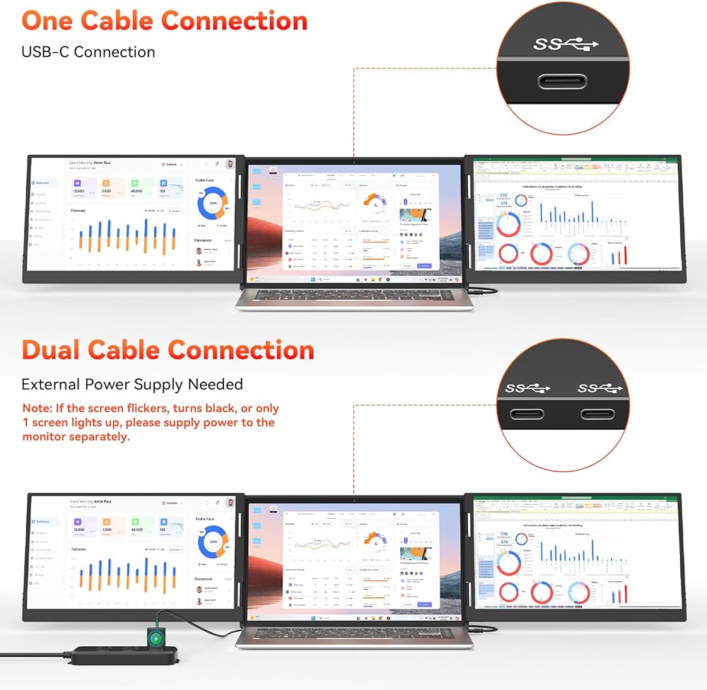 إعداد شاشة محمولة ثلاثية بكابل واحد - قم بتبسيط مساحة العمل الخاصة بك باستخدام موسع شاشة الكمبيوتر المحمول الحقيقي الذي يعمل بالتوصيل والتشغيل. باستخدام كابل USB-C واحد فقط، يمكنك تشغيل كلتا الشاشتين وتوصيلهما، دون الحاجة إلى كابلات أو برامج تشغيل أو محولات إضافية. قم بالتبديل على الفور بين أوضاع المرآة والتوسيع والصورة وغيرها من الأوضاع للقيام بمهام متعددة مرنة أثناء التنقل. 【ملاحظة: يجب أن يدعم منفذ USB من النوع C بجهاز الكمبيوتر المحمول الذي يعمل بنظام التشغيل Windows Thunderbolt 3/4 أو USB 3.1 DP Alt Mode】