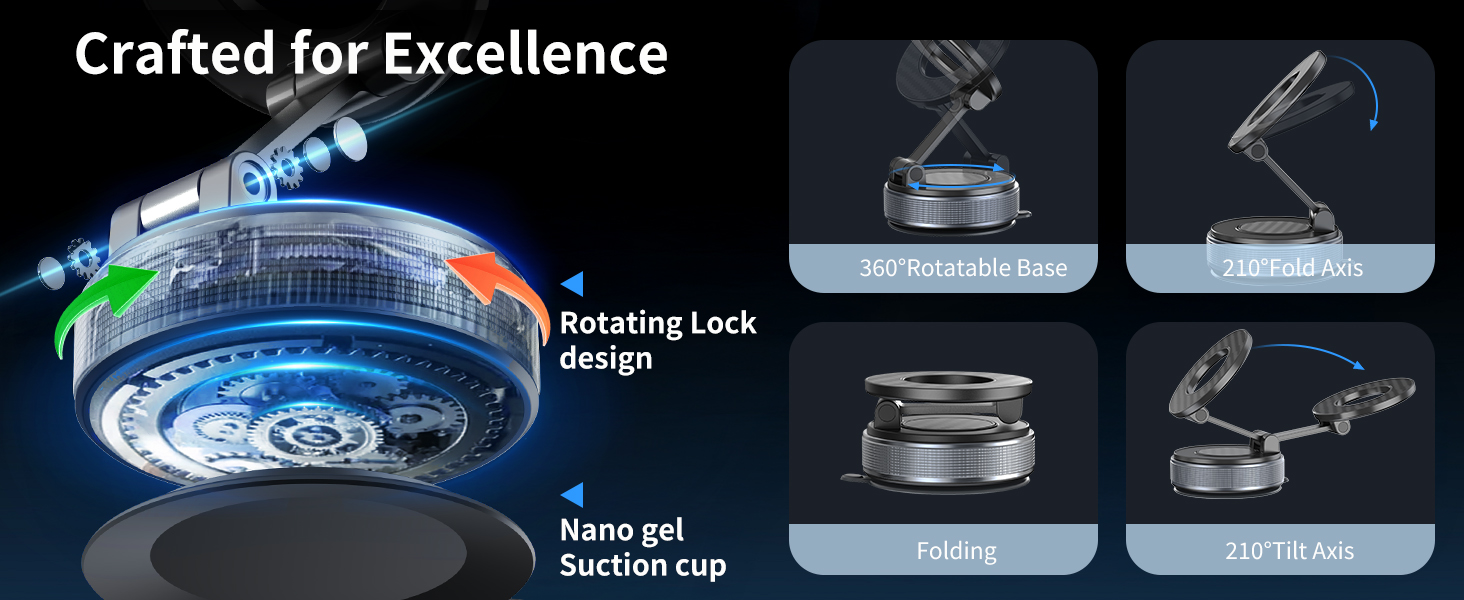 دوران 360 درجة وتعديل ثنائي المحور: يتميز حامل هاتف السيارة هذا بنظام دوران ثنائي المحور متطور، مما يوفر تعديلًا سلسًا 360 درجة في كل من الوضعين الرأسي والأفقي للحصول على حرية الرؤية الكاملة. سواء كنت في السيارة أو المكتب أو المطبخ أو صالة الألعاب الرياضية أو حتى الحمام، يمكنك بسهولة تخصيص زاوية المشاهدة الخاصة بك. يقلل التصميم المبتكر القابل للطي من حجم القاعدة بنسبة 60% عند عدم الاستخدام، مما يحافظ على المساحة الخاصة بك أنيقة ومنظمة. تشتمل القاعدة على آلية مفصلية دقيقة تنتج صوتًا ناعمًا ورطبًا عند الدوران. خضعت المحامل لاختبارات المتانة لأكثر من 3000 دورة فتح وإغلاق، مما يضمن بقائها آمنة وسريعة الاستجابة حتى بعد الاستخدام لفترة طويلة.