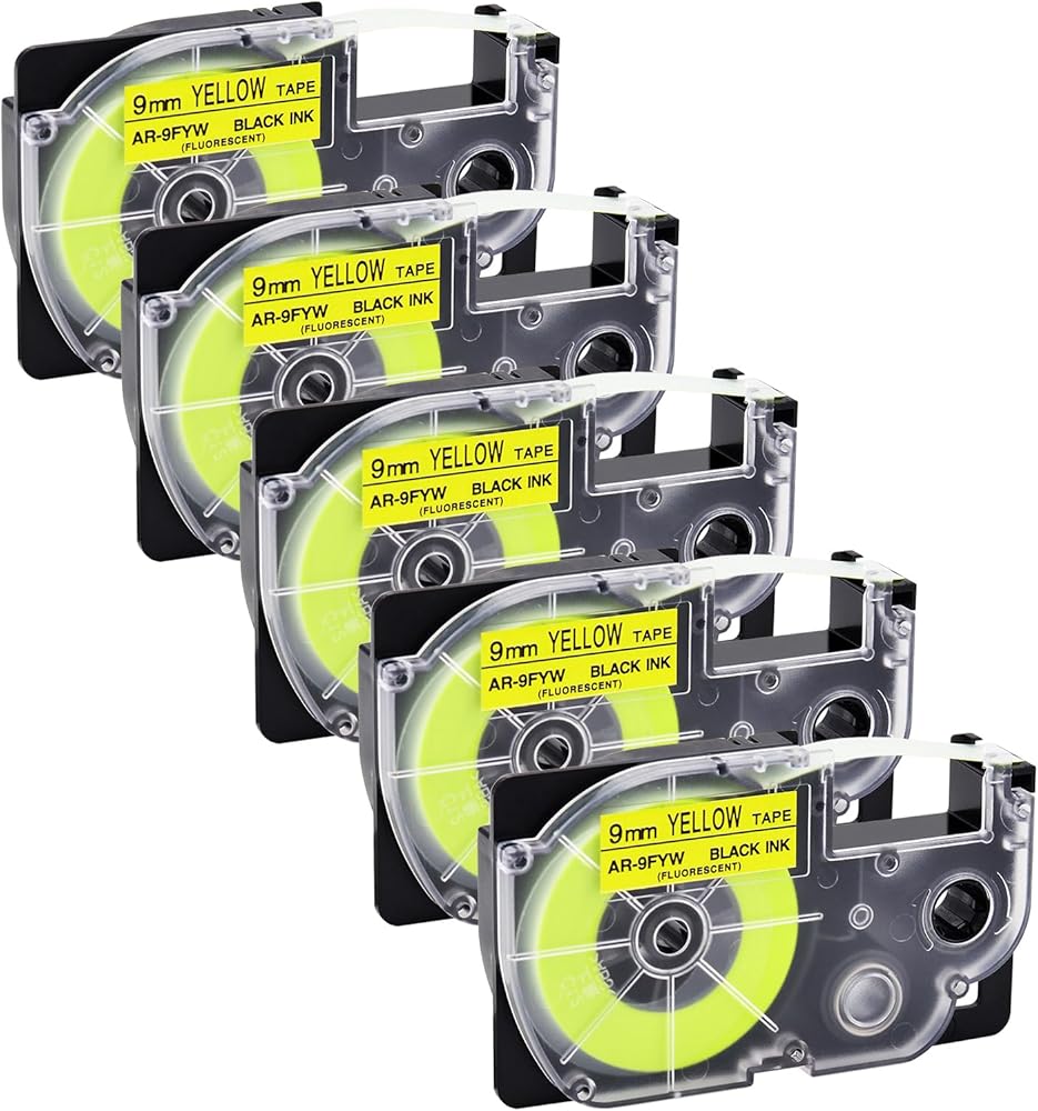 شريط ملصقات 5 قطع متوافق مع شريط الكاسيت XR9FYW XR-9FYW XR-9FYW2S XR9FYW2S 9 مم 0.35 بوصة × 26.2 قدم، بديل لصانع الملصقات KL-120 KL-430 KL-1500 KL-2000، أسود على أصفر فلورسنت