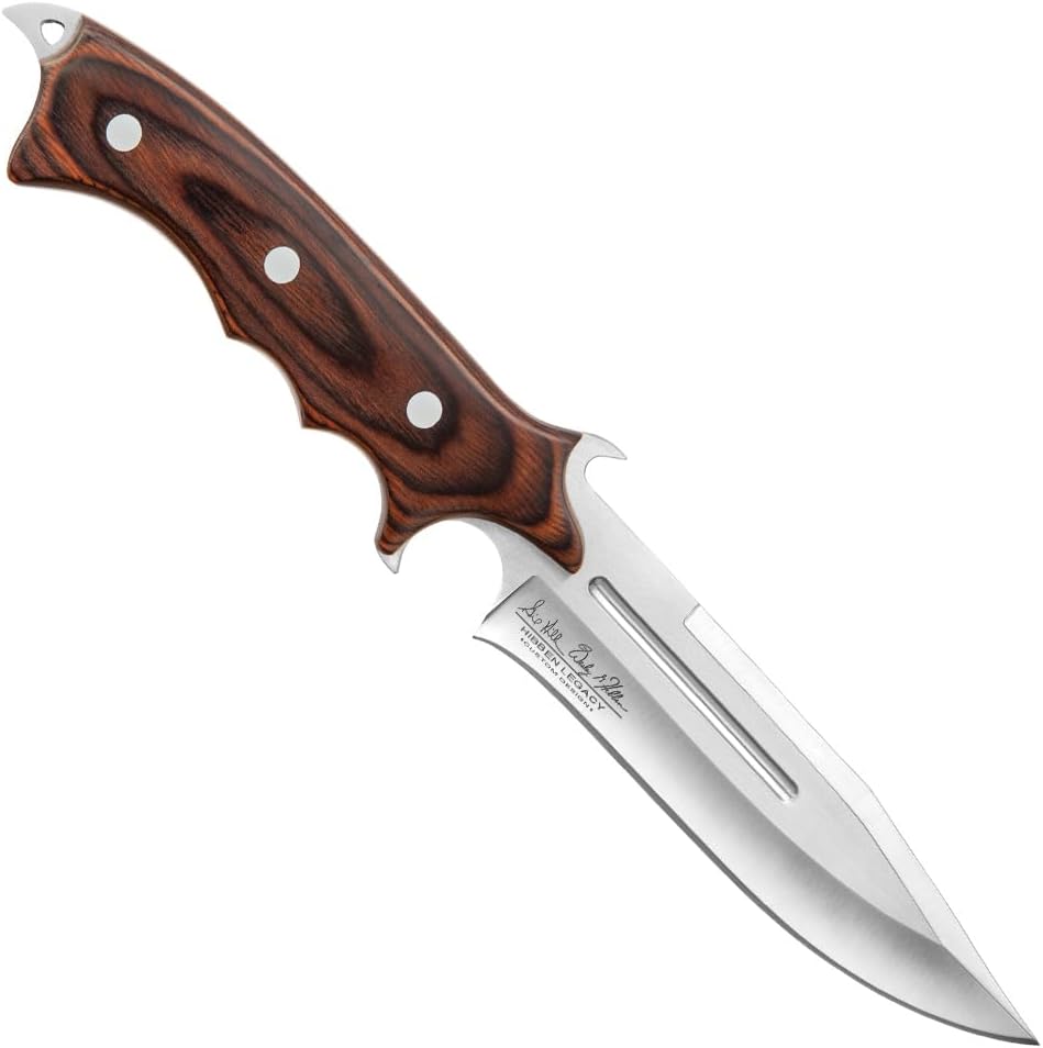 جيل هيبن ليجاسي سكين II | 7CR17 شفرة من الفولاذ المقاوم للصدأ | متسلسلة ومحفورة بالليزر | مقبض خشب الباكاو البني | تانغ كامل | غلاف من الجلد الطبيعي متضمن | الطول الإجمالي 12 بوصة