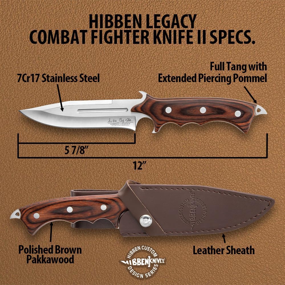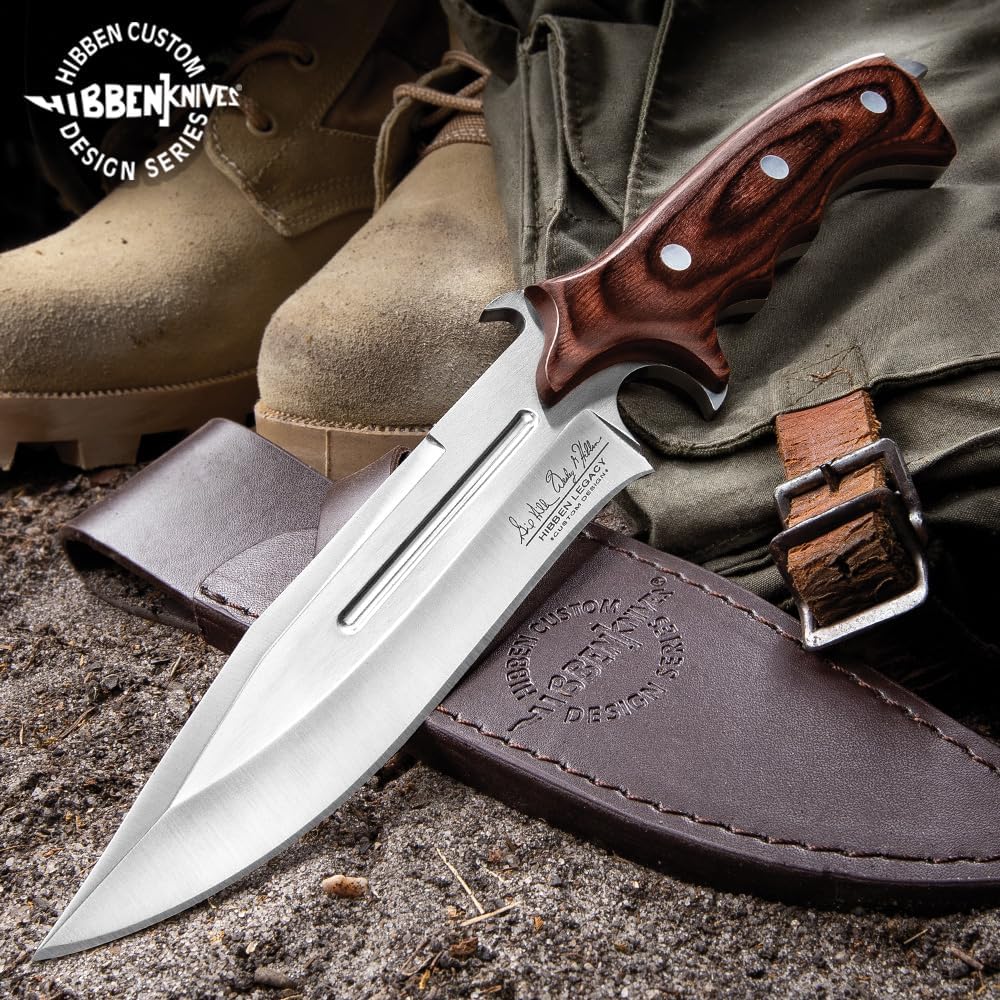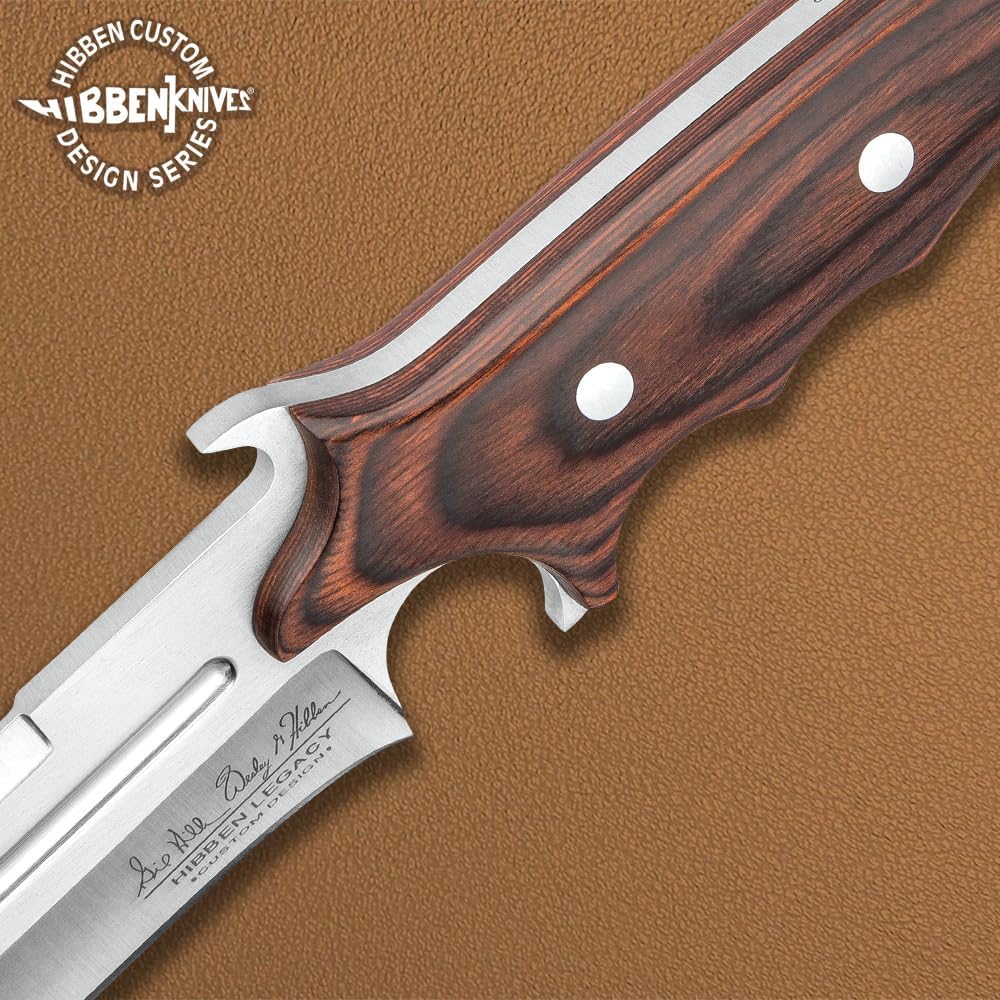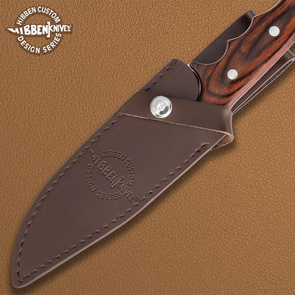 CUSTOM LEATHER SHEATH: Enhance the collectability of this 12" overall knife with a custom leather sheath. Proudly stamped with the “Hibben Knives Custom Design Series” logo, it adds a touch of authenticity to your collection.