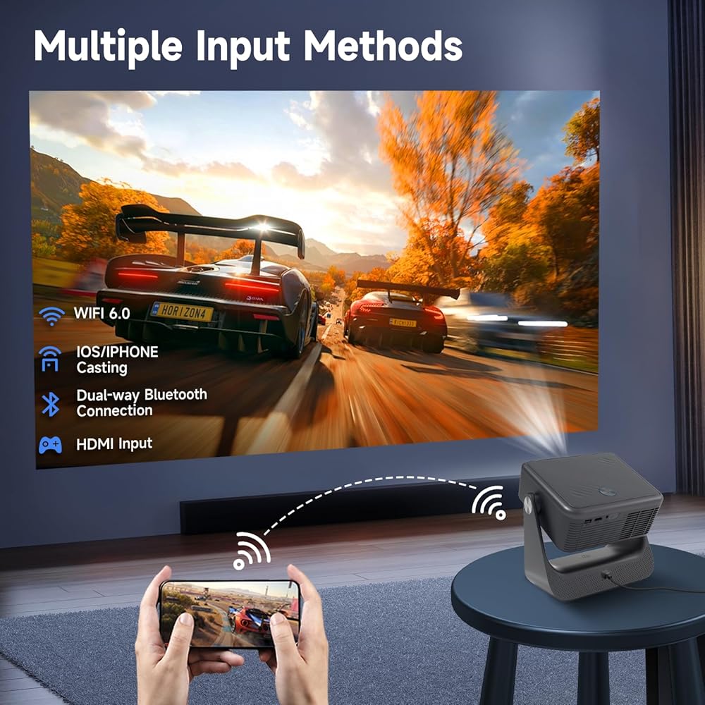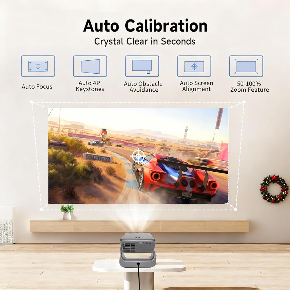 • 【معايرة تلقائية خالية من المتاعب】فقط قم بتشغيله، وسيقوم جهاز العرض الذكي بالمعايرة تلقائيًا، ويقدم صورة حادة ومستطيلة على الفور. وهو يدعم التركيز التلقائي، وحجر المفاتيح التلقائي، وتجنب العوائق التلقائية، وملاءمة الشاشة التلقائية ونطاق التكبير/التصغير 50%-100%. لا تعاني أبدًا من الصور الباهتة أو الملتوية مرة أخرى.