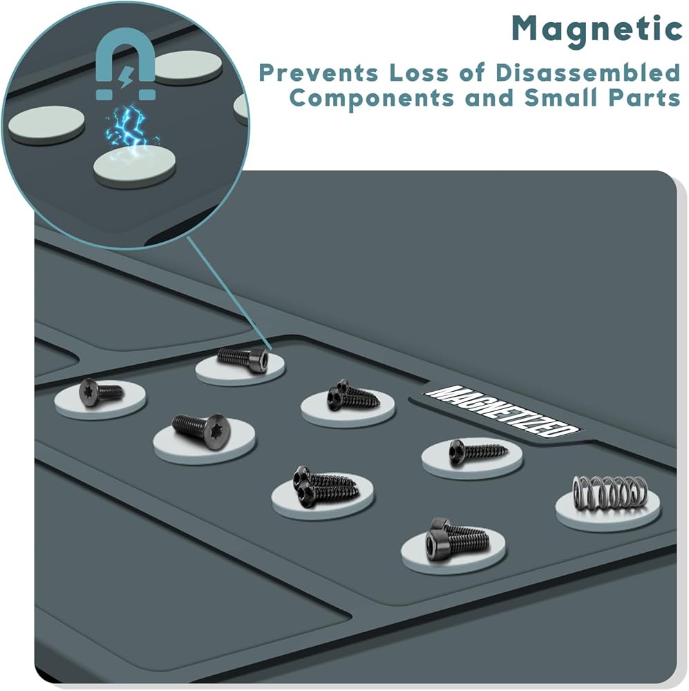 التصميم المغناطيسي: تم تصميم بساط تنظيف المسدس بمساحة مغناطيسية صغيرة مدمجة بـ 8 مغناطيسات مستديرة. تعتبر اللوحة المغناطيسية الموجودة على الجانب الأيمن العلوي من لوحة الصيانة مثالية لحمل الأجزاء المفككة والمكونات الصغيرة.