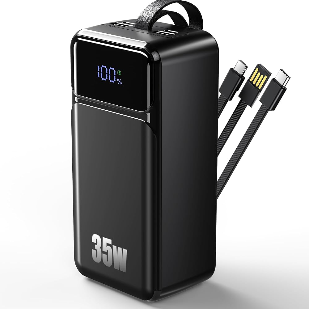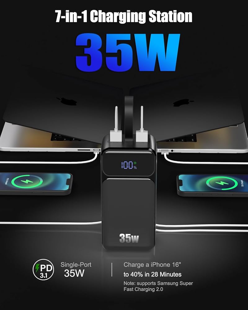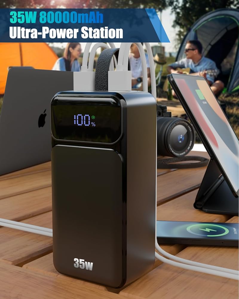 بنك طاقة بقدرة 80000 مللي أمبير في الساعة، شاحن محمول سريع الشحن بقدرة 35 وات مدمج بـ 3 كابلات مع 7 منافذ، حزمة بطارية خارجية عالية السعة لأجهزة iPhone وGalaxy وSteam Deck وأساسيات السفر والتخييم