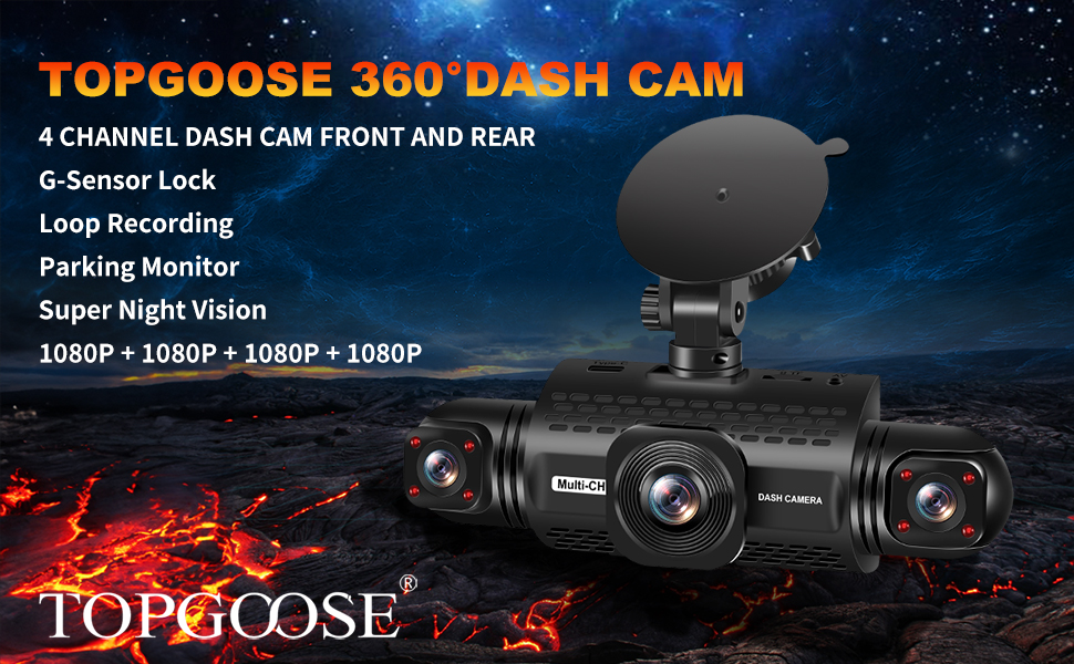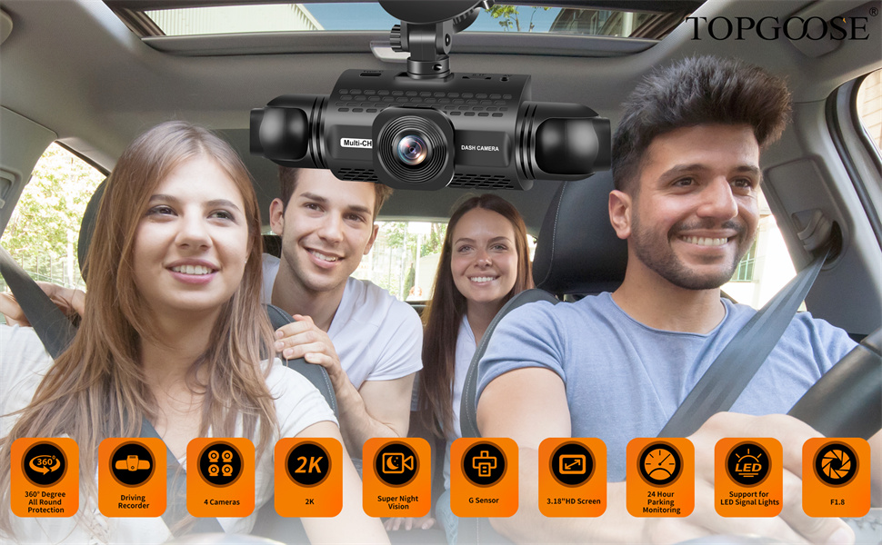 • ✔【كاميرا داش كام 360 درجة من جميع الجوانب 4 قنوات】تحتوي كاميرا داش كام TOPGOOSE ذات 4 قنوات على 4 عدسات، جميعها قادرة على تسجيل فيديو FHD 1080P في وقت واحد. يمكنه التقاط الجوانب الأمامية والخلفية واليسرى والأيمن للسيارة في وقت واحد. يمكن للعدسات الثلاث الأمامية ضبط زاوية التصوير حتى تتمكن من التقاط المزيد من التفاصيل كما تريد. يمكنه تغطية 360 درجة بسهولة، مما يضمن عدم وجود زاوية ميتة حول السيارة. يمكنك استخدام عدسة واحدة لالتقاط الجزء الداخلي من سيارتك.