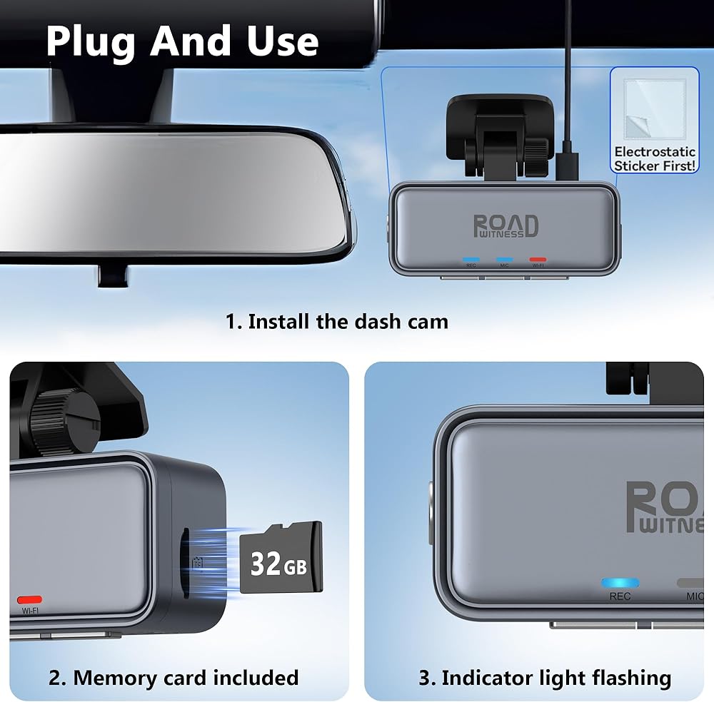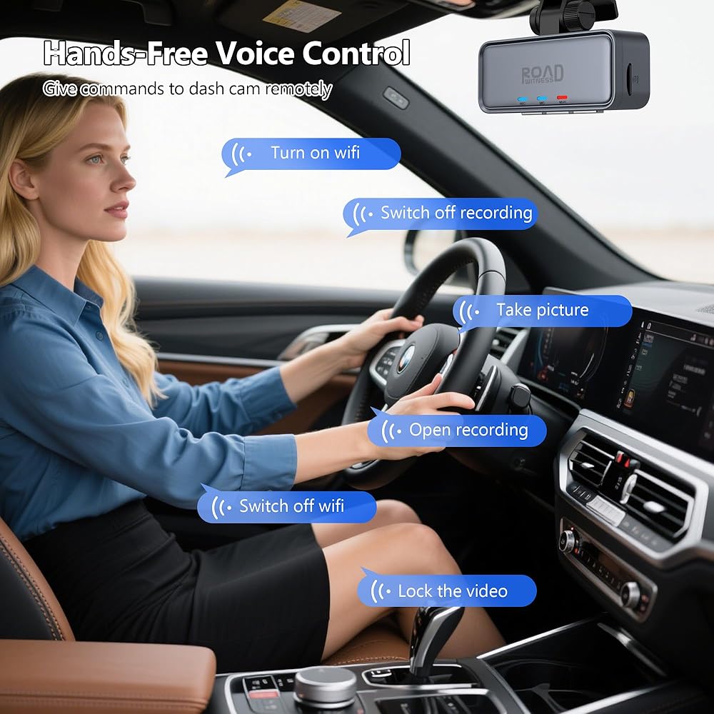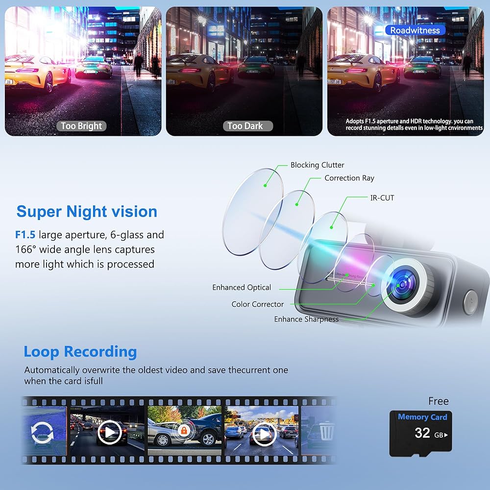 كاميرا أمامية صغيرة بدقة 4K، كاميرا أمامية للسيارات، كاميرا سيارة WiFi مع التحكم الصوتي، رؤية ليلية، مستشعر G، وضع انتظار السيارات على مدار 24 ساعة، تطبيق تسجيل حلقي، كاميرا Dashcam 4K متضمنة 32 جيجابايت، تدعم 256 جيجابايت