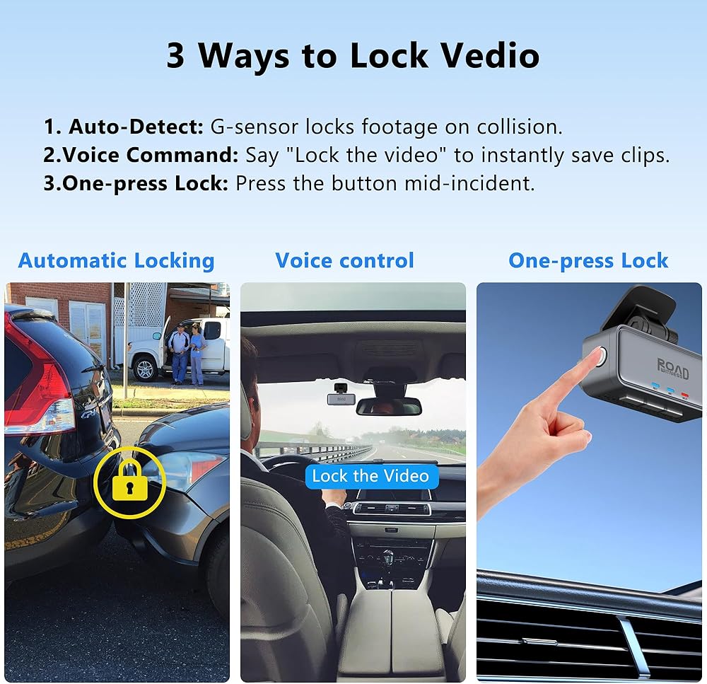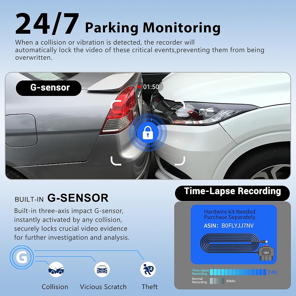 • 【وضعين وقوف السيارات 】1. وضع وقوف السيارات للكشف عن الاصطدام، يمكن لجهاز استشعار G اكتشاف الاصطدام وقفل الفيديو؛ 2. وضع وقوف السيارات بفاصل زمني، يمكن لكاميرا لوحة عدادات السيارة الأمامية والخلفية التسجيل بشكل مستمر لمدة 24/7 ساعات، وتتميز بالسجلات بمعدل إطار منخفض للحفاظ على الطاقة مع الحفاظ على اليقظة